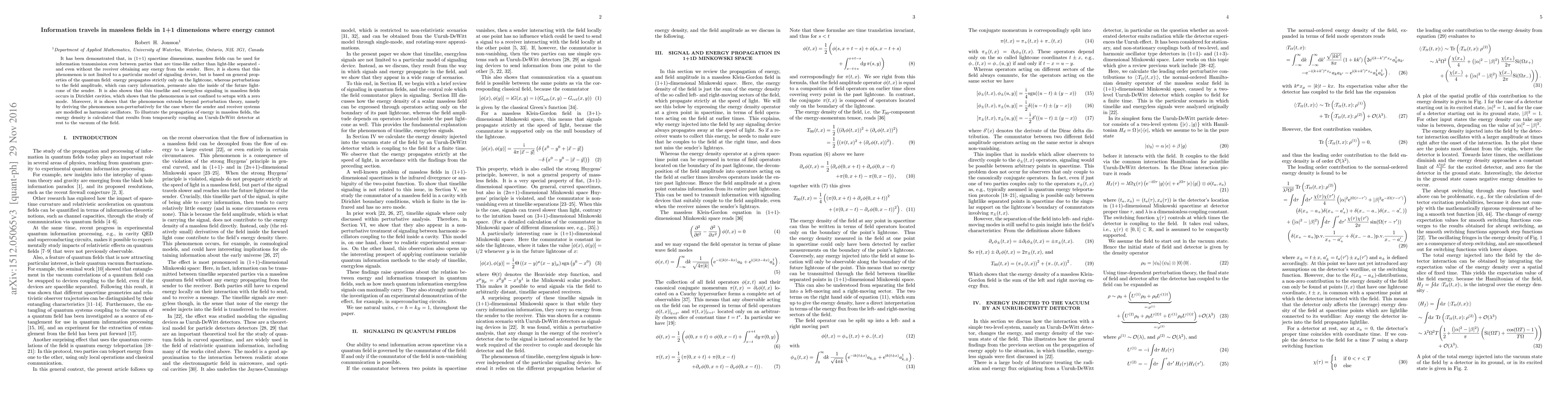 This paper demonstrates that in 1+1 dimensions, massless fields can transmit information across time-like separations without energy transfer, relying on general quantum field properties where energy confines to the lightcone while information-carrying perturbations spread beyond it. The phenomenon is shown to be non-model-specific and extends beyond perturbation theory to harmonic oscillators.