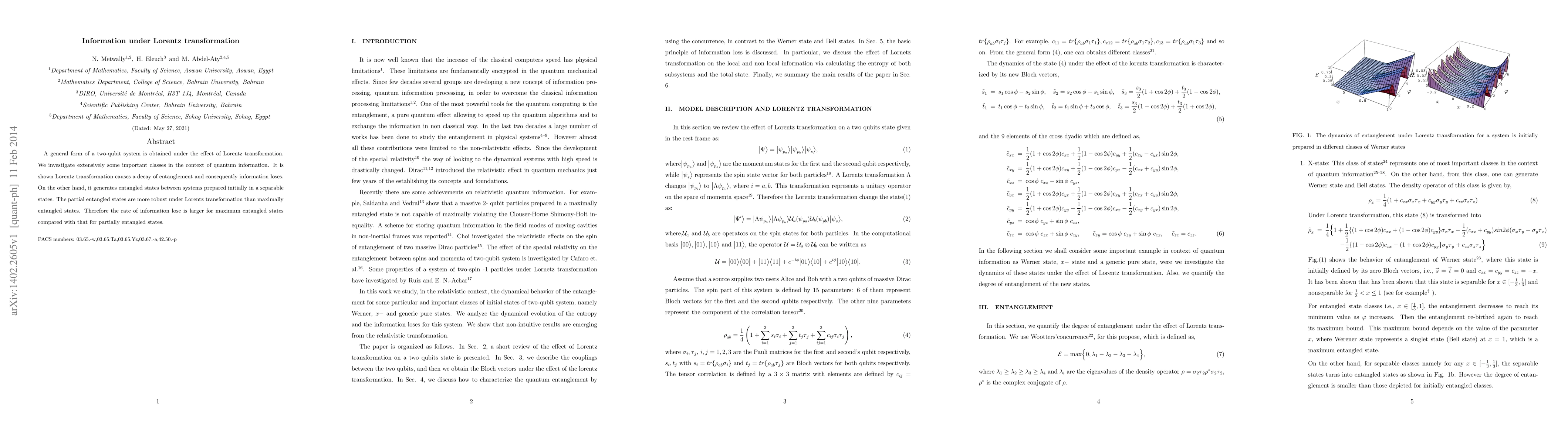 This paper explores the impact of Lorentz transformations on a two-qubit system, revealing that such transformations lead to a loss of entanglement and information. Partially entangled states are found to be more resilient than maximally entangled states under Lorentz transformations.