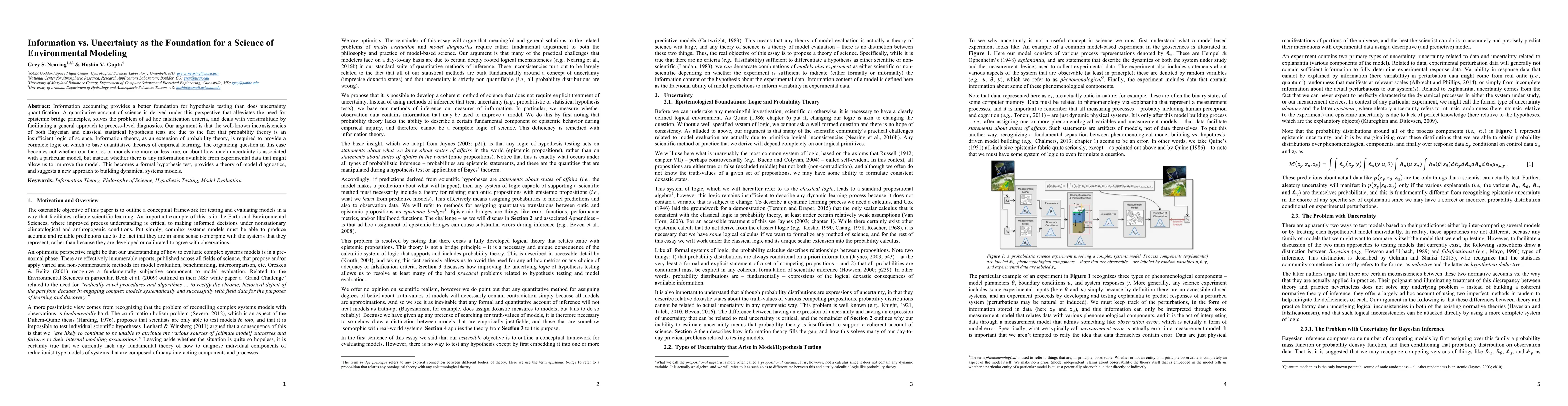 A new approach to environmental modeling is proposed based on information theory, shifting focus from uncertainty quantification to improving models with available data. This method provides a formal framework for hypothesis testing and model diagnostics, potentially resolving inconsistencies in traditional statistical tests.
