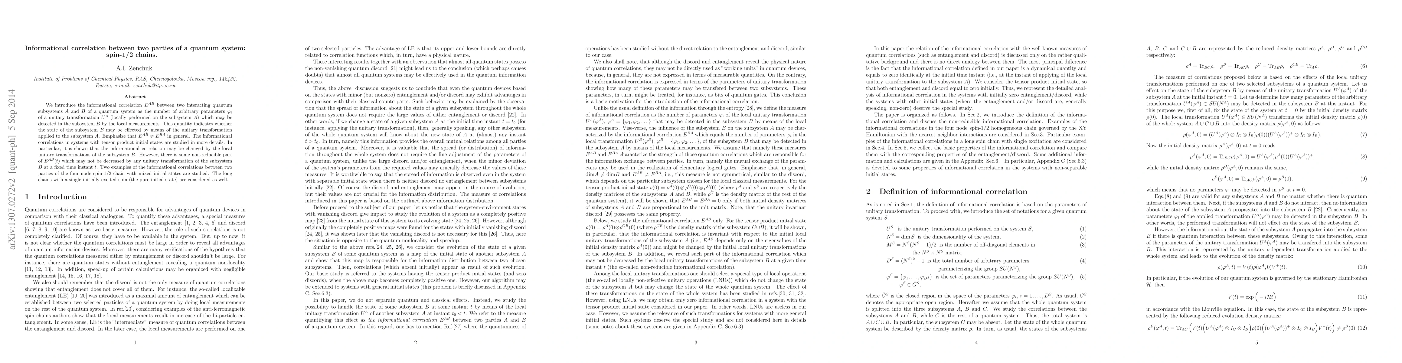 We introduce the informational correlation $E^{AB}$ between two interacting quantum subsystems $A$ and $B$ of a quantum system as the number of arbitrary parameters $\varphi_i$ of a unitary transformation $U^A$ (locally performed on the subsystem $A$) which may be detected in the subsystem $B$ by the local measurements. This quantity indicates whether the state of the subsystem $B$ may be effected by means of the unitary transformation applied to the subsystem $A$. Emphasize that $E^{AB}\neq E^{BA}$ in general. The informational correlations in systems with tensor product initial states are studied in more details. In particular, it is shown that the informational correlation may be changed by the local unitary transformations of the subsystem $B$. However, there is some non-reducible part of $E^{AB}(t)$ which may not be decreased by any unitary transformation of the subsystem $B$ at a fixed time instant $t$. Two examples of the informational correlations between two parties of the four node spin-1/2 chain are studied.