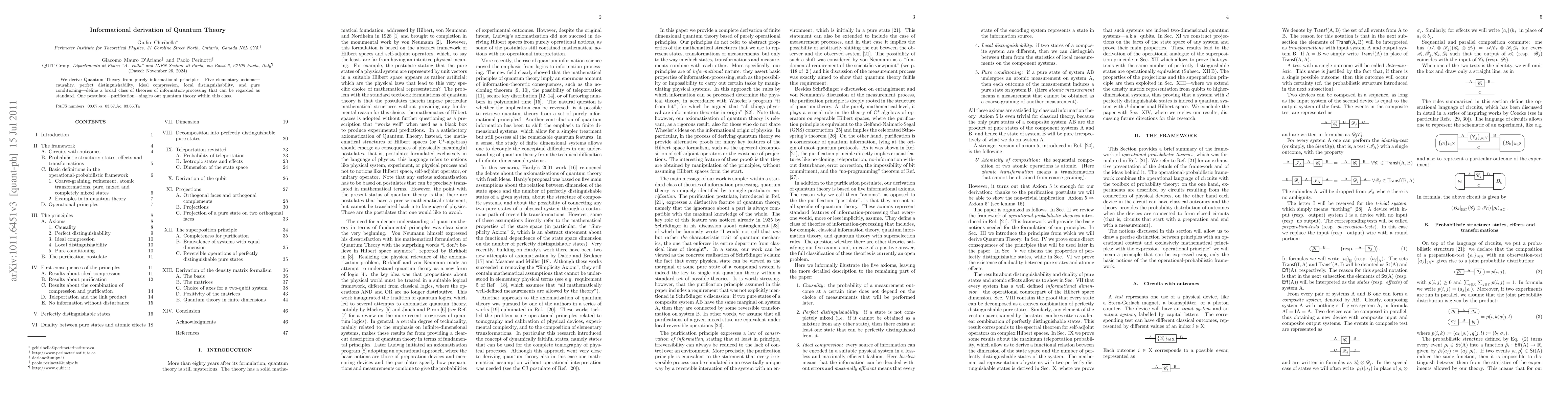 Quantum theory can be derived from information principles using 5 axioms, with purification postulate distinguishing it from other theories. This framework provides a novel alternative to Hilbert space-based quantum mechanics.