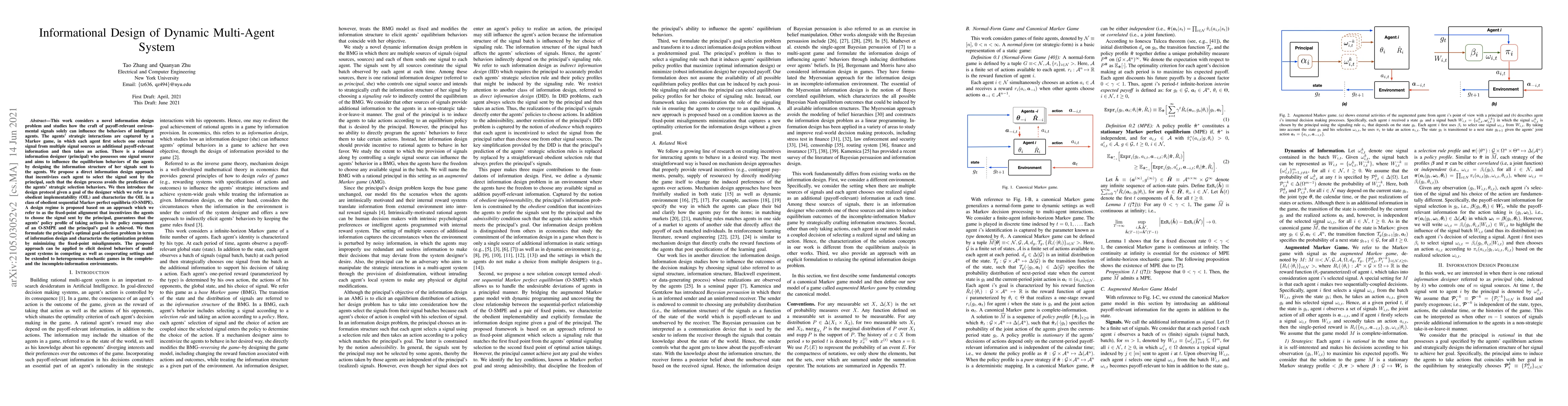 This work considers a novel information design problem and studies how the craft of payoff-relevant environmental signals solely can influence the behaviors of intelligent agents. The agents' strategic interactions are captured by a Markov game, in which each agent first selects one external signal from multiple signal sources as additional payoff-relevant information and then takes an action. There is a rational information designer (principal) who possesses one signal source and aims to influence the equilibrium behaviors of the agents by designing the information structure of her signals sent to the agents. We propose a direct information design approach that incentivizes each agent to select the signal sent by the principal, such that the design process avoids the predictions of the agents' strategic selection behaviors. We then introduce the design protocol given a goal of the designer which we refer to as obedient implementability (OIL) and characterize the OIL in a class of obedient sequential Markov perfect equilibria (O-SMPE). A design regime is proposed based on an approach which we refer to as the fixed-point alignment that incentivizes the agents to choose the signal sent by the principal, guarantees that the agents' policy profile of taking actions is the policy component of an O-SMPE and the principal's goal is achieved. We then formulate the principal's optimal goal selection problem in terms of information design and characterize the optimization problem by minimizing the fixed-point misalignments. The proposed approach can be applied to elicit desired behaviors of multi-agent systems in competing as well as cooperating settings and be extended to heterogeneous stochastic games in the complete- and the incomplete-information environments.