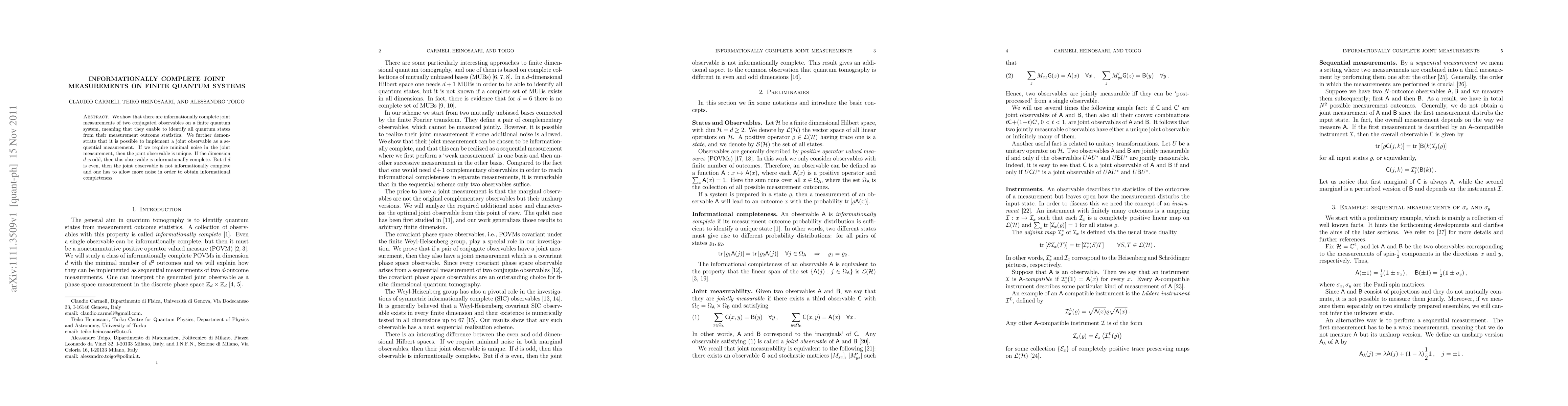 This paper demonstrates the existence of informationally complete joint measurements for two conjugated observables on finite quantum systems, allowing identification of all quantum states. It also shows that such measurements can be implemented sequentially, with minimal noise ensuring uniqueness when the system dimension is odd, but requiring more noise for completeness when the dimension is even.