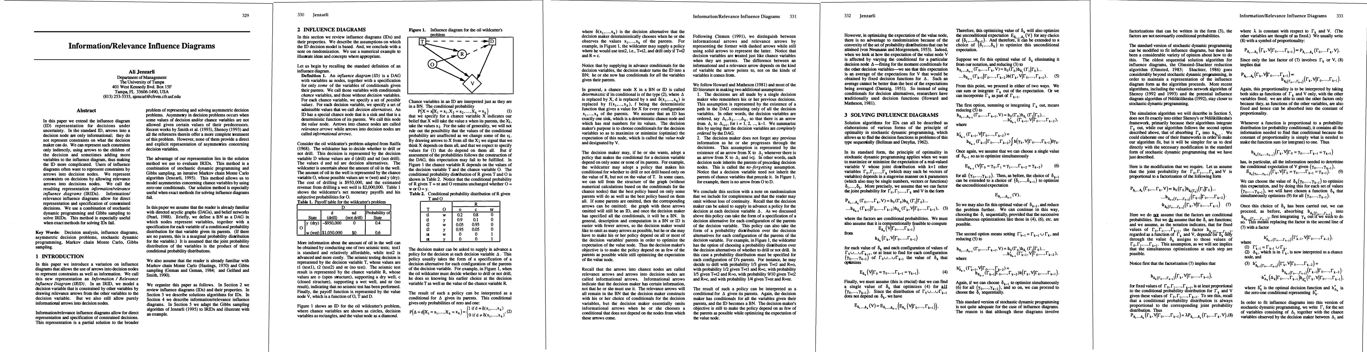 This paper introduces information/relevance influence diagrams (IRIDs) to directly represent constraints on decision nodes in influence diagrams, enhancing their utility. It employs stochastic dynamic programming and Gibbs sampling to solve IRIDs, offering a solution when exact methods fail.