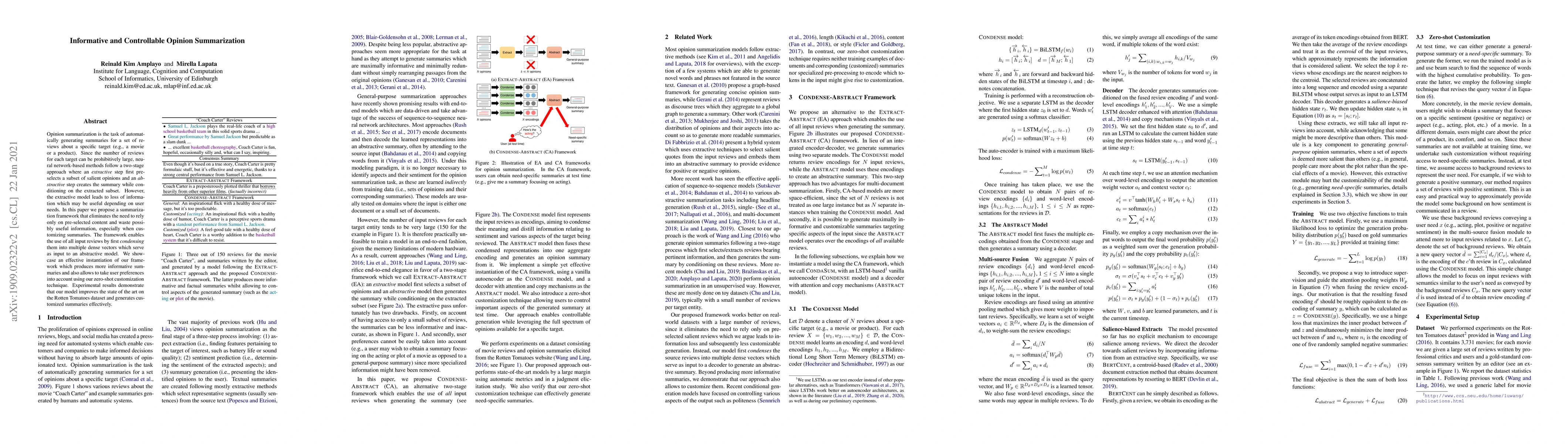 Researchers propose a new summarization framework that uses dense vectors to condense input reviews, producing more informative summaries with customizable options. Their approach outperforms the state of the art on the Rotten Tomatoes dataset.