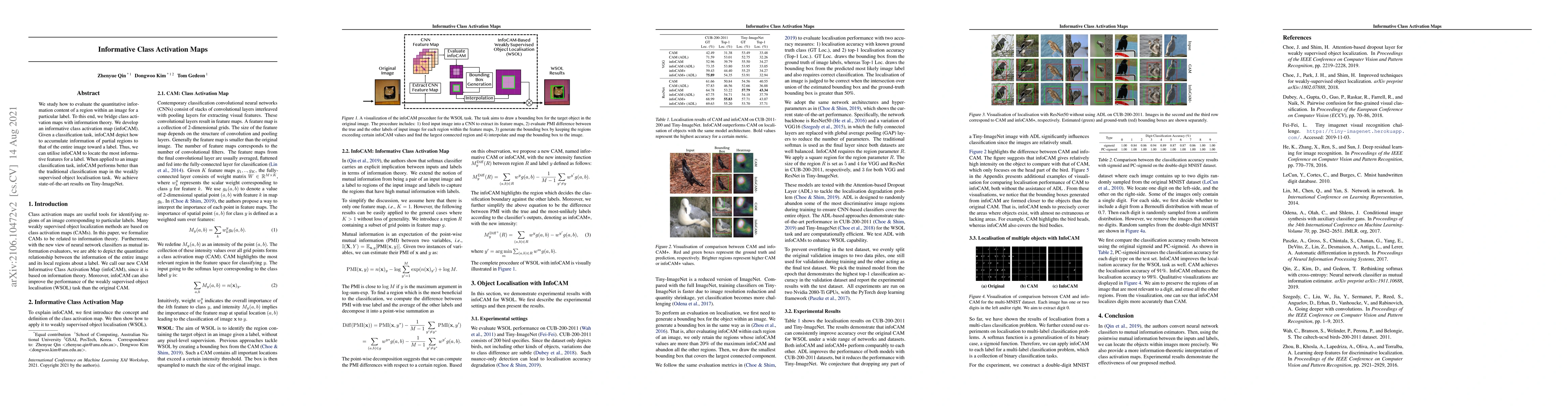 We study how to evaluate the quantitative information content of a region within an image for a particular label. To this end, we bridge class activation maps with information theory. We develop an informative class activation map (infoCAM). Given a classification task, infoCAM depict how to accumulate information of partial regions to that of the entire image toward a label. Thus, we can utilise infoCAM to locate the most informative features for a label. When applied to an image classification task, infoCAM performs better than the traditional classification map in the weakly supervised object localisation task. We achieve state-of-the-art results on Tiny-ImageNet.