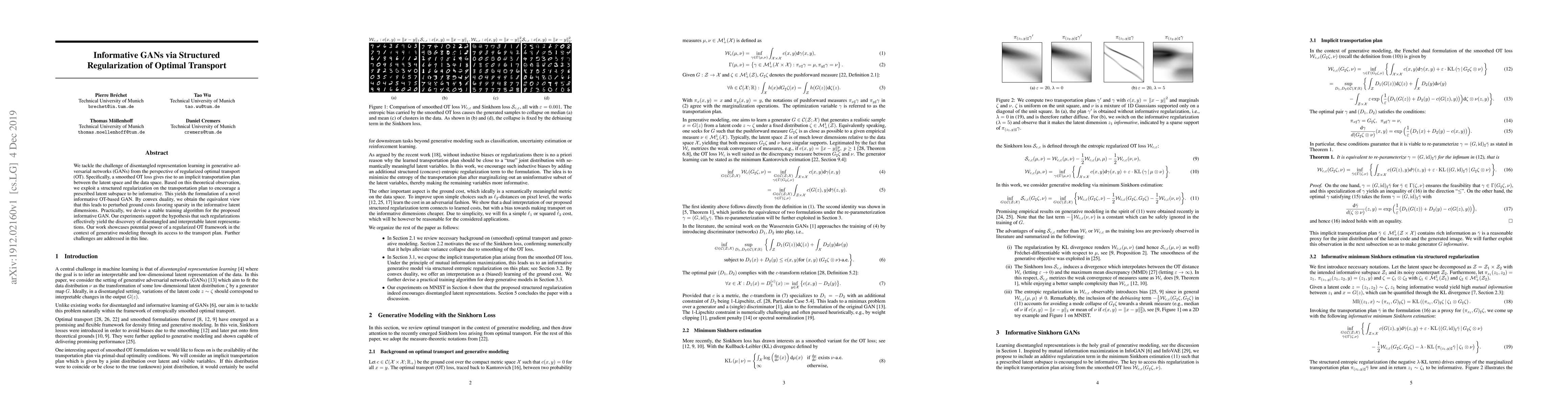 This paper proposes a novel informative GAN using structured regularization of optimal transport to encourage disentangled representation learning. The approach leverages a smoothed OT loss and sparsity-favoring perturbations to discover interpretable latent dimensions, supported by a stable training algorithm and experimental validation.