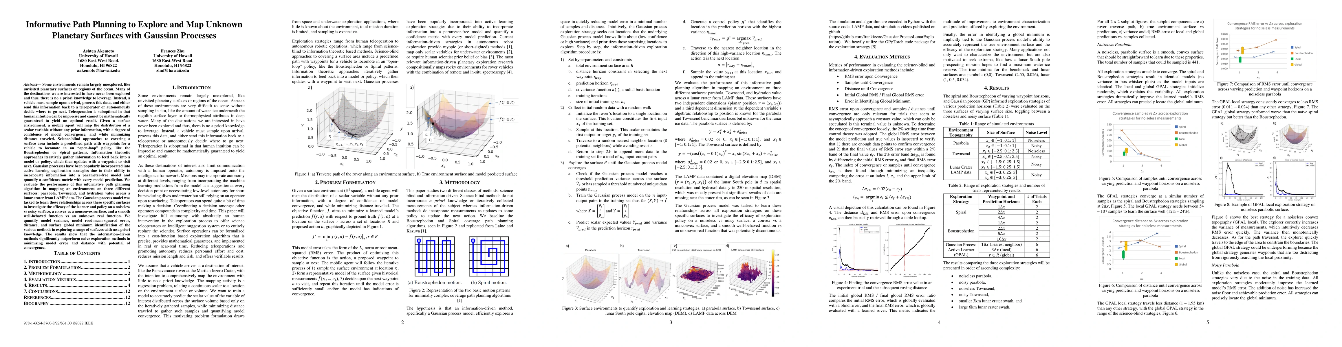 Many environments, such as unvisited planetary surfaces and oceanic regions, remain unexplored due to a lack of prior knowledge. Autonomous vehicles must sample upon arrival, process data, and either transmit findings to a teleoperator or decide where to explore next. Teleoperation is suboptimal, as human intuition lacks mathematical guarantees for optimality. This study evaluates an informative path planning algorithm for mapping a scalar variable distribution while minimizing travel distance and ensuring model convergence. We compare traditional open loop coverage methods (e.g., Boustrophedon, Spiral) with information-theoretic approaches using Gaussian processes, which update models iteratively with confidence metrics. The algorithm's performance is tested on three surfaces, a parabola, Townsend function, and lunar crater hydration map, to assess noise, convexity, and function behavior. Results demonstrate that information-driven methods significantly outperform naive exploration in reducing model error and travel distance while improving convergence potential.