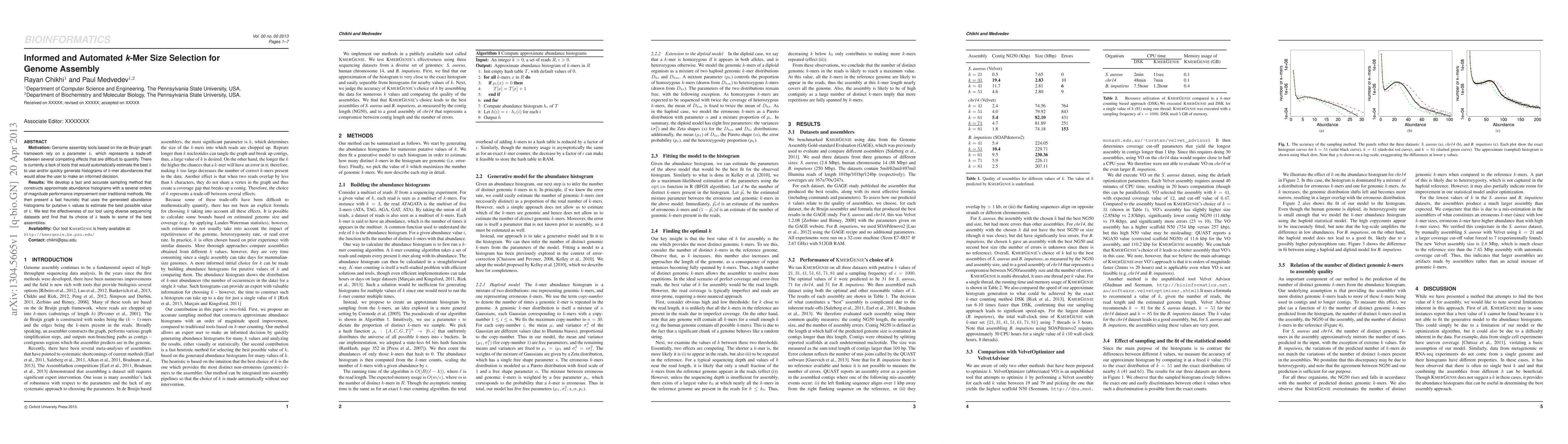 This paper introduces KmerGenie, a tool for automated k-mer size selection in genome assembly, which uses a fast sampling method to generate k-mer abundance histograms and a heuristic to estimate the optimal k value, significantly improving performance over traditional methods. The tool was tested on various datasets, showing effective k selection leading to high-quality genome assemblies.