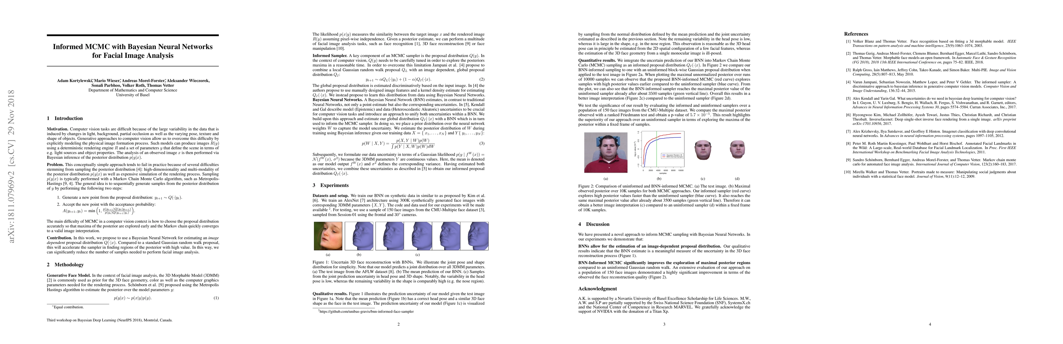 This paper proposes using Bayesian Neural Networks to estimate an image-dependent proposal distribution for Markov Chain Monte Carlo (MCMC) sampling, improving the efficiency of facial image analysis in computer vision tasks. This approach accelerates the sampler in exploring high-value regions of the posterior, thus reducing the number of required samples.
