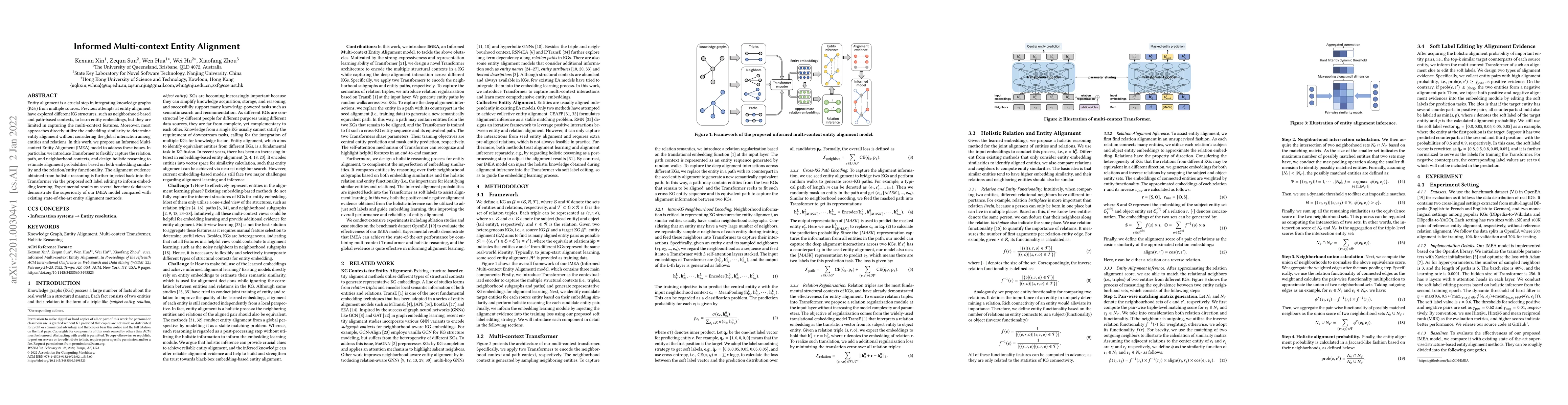 The paper proposes an Informed Multi-context Entity Alignment (IMEA) model that leverages Transformer to capture various KG contexts and uses holistic reasoning to improve alignment probabilities, achieving better results than existing methods on benchmark datasets. The model integrates alignment evidence back into the Transformer for enhanced embedding learning.
