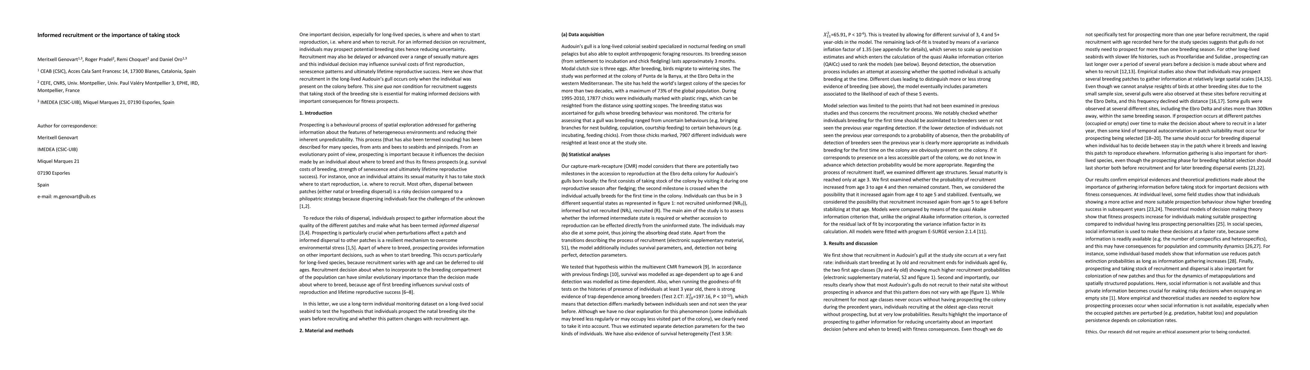 One important decision, especially for long-lived species, is where and when to start reproduction, i.e. where and when to recruit. For an informed decision on recruitment, individuals may prospect potential breeding sites and gather information on the future breeding site, hence reducing uncertainty. Recruitment may also be delayed or advanced over a range of sexually mature ages and this individual decision may influence survival costs of first reproduction, senescence patterns and ultimately lifetime reproductive success. Here we show that recruitment in the long-lived Audouin's gull is mostly informed, meaning that mainly occurs when the individual has visited the colony before. Individuals recruiting without gathering information were all young first-time breeders. Interestingly, these recruits were affected by demographic carry-over effects: first, they were much less prone to reproduce in subsequent seasons than individuals that performed informed recruitment. More strikingly, uninformed recruitment also affected survival, which was much lower for those individuals breeding without gathering information on the breeding site. This study suggests that taking stock before recruitment may be crucial for reducing environmental uncertainty and for maximising individual fitness prospects.