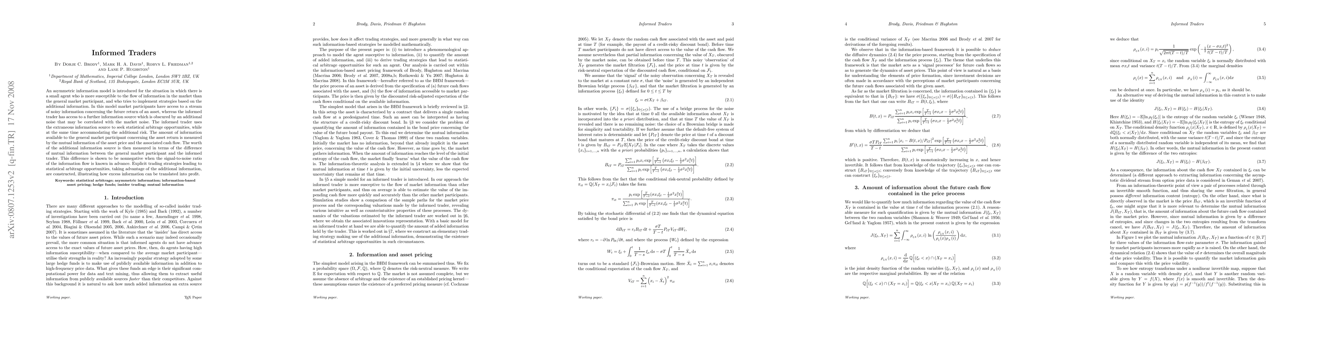 This paper presents a model of informed traders with access to additional, noisy information for statistical arbitrage. It quantifies the value of extra information using mutual information difference, proving non-negativity with known signal-to-noise ratio. Explicit trading strategies are provided to exploit this information for profit.
