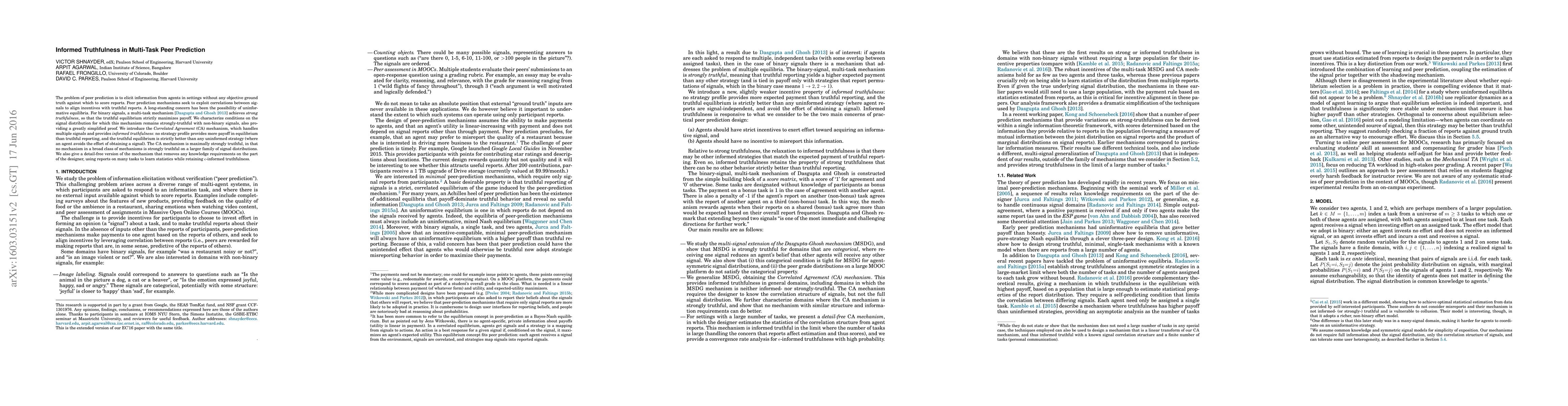 A new peer prediction mechanism, Correlated Agreement (CA), achieves informed truthfulness for multiple signals, ensuring truthful reporting is strictly better than any uninformed strategy in equilibrium.