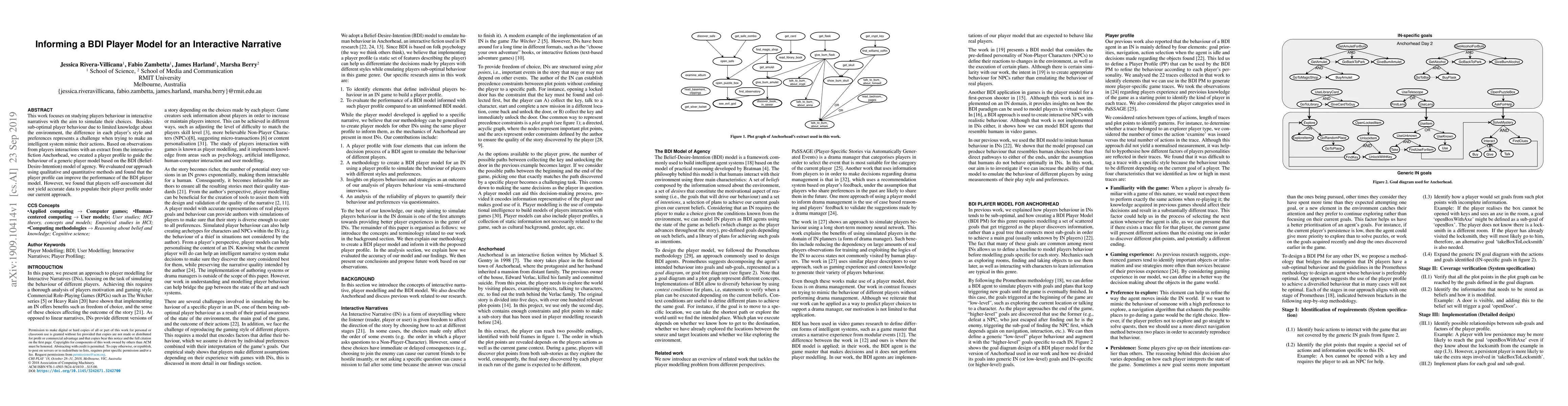 This research develops a BDI player model to simulate choices in interactive narratives by profiling player behavior from interactions with Anchorhead. While the player profile enhances model performance, self-assessments from players were found to be inaccurate for profile creation.