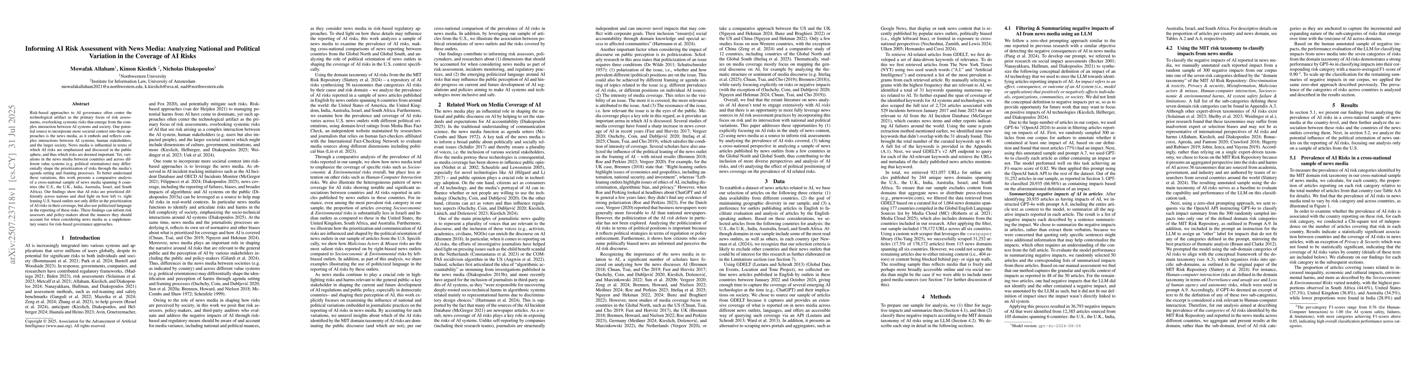 Risk-based approaches to AI governance often center the technological artifact as the primary focus of risk assessments, overlooking systemic risks that emerge from the complex interaction between AI systems and society. One potential source to incorporate more societal context into these approaches is the news media, as it embeds and reflects complex interactions between AI systems, human stakeholders, and the larger society. News media is influential in terms of which AI risks are emphasized and discussed in the public sphere, and thus which risks are deemed important. Yet, variations in the news media between countries and across different value systems (e.g. political orientations) may differentially shape the prioritization of risks through the media's agenda setting and framing processes. To better understand these variations, this work presents a comparative analysis of a cross-national sample of news media spanning 6 countries (the U.S., the U.K., India, Australia, Israel, and South Africa). Our findings show that AI risks are prioritized differently across nations and shed light on how left vs. right leaning U.S. based outlets not only differ in the prioritization of AI risks in their coverage, but also use politicized language in the reporting of these risks. These findings can inform risk assessors and policy-makers about the nuances they should account for when considering news media as a supplementary source for risk-based governance approaches.