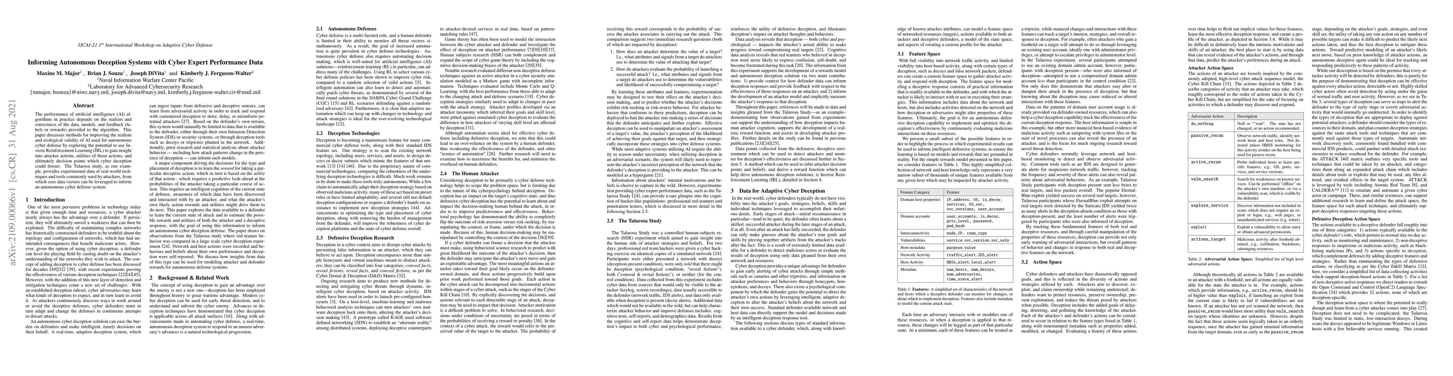 The performance of artificial intelligence (AI) algorithms in practice depends on the realism and correctness of the data, models, and feedback (labels or rewards) provided to the algorithm. This paper discusses methods for improving the realism and ecological validity of AI used for autonomous cyber defense by exploring the potential to use Inverse Reinforcement Learning (IRL) to gain insight into attacker actions, utilities of those actions, and ultimately decision points which cyber deception could thwart. The Tularosa study, as one example, provides experimental data of real-world techniques and tools commonly used by attackers, from which core data vectors can be leveraged to inform an autonomous cyber defense system.