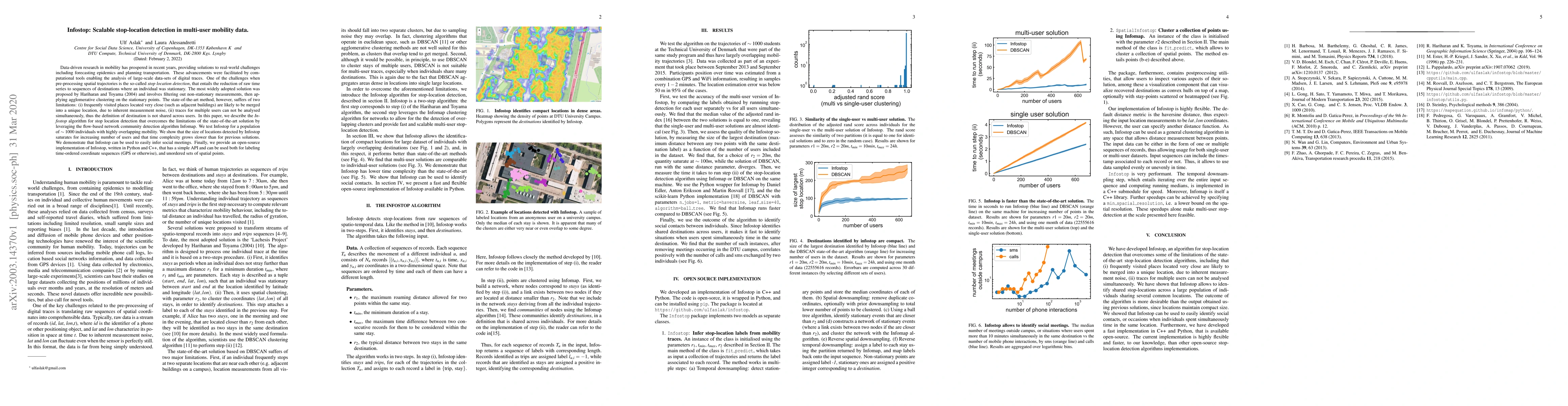 The Infostop algorithm detects stop locations in multi-user mobility data more accurately than previous methods, allowing for better analysis of population movement patterns, including social meetings.