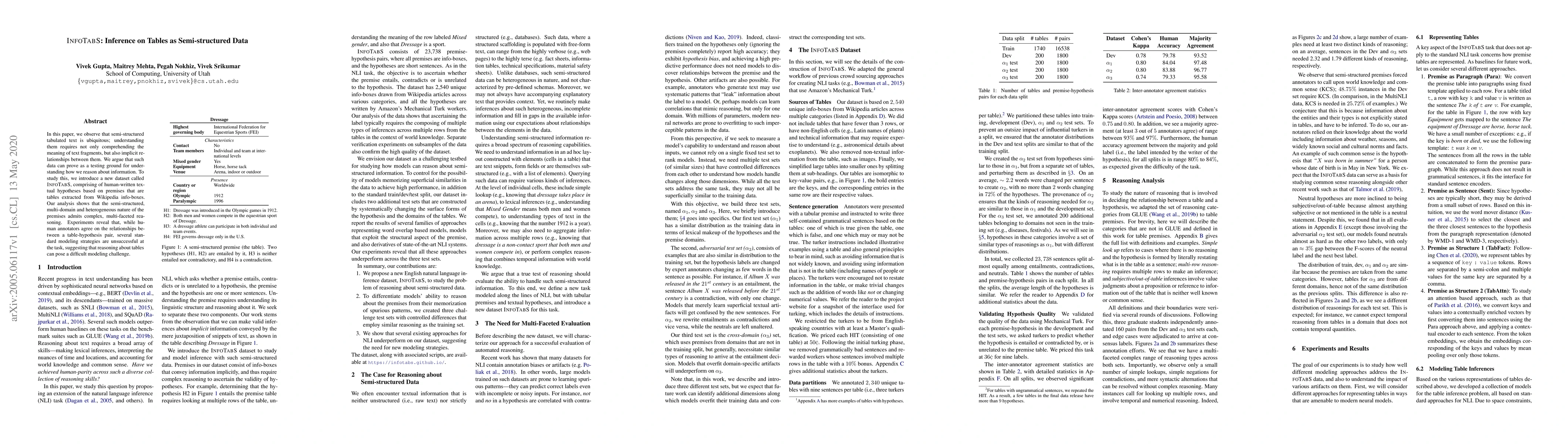 This paper introduces INFOTABS, a dataset of human-written hypotheses based on Wikipedia info-box tables, to study reasoning about semi-structured data. Experiments show that while humans can easily infer relationships, standard models struggle, highlighting the complexity of reasoning about such data.
