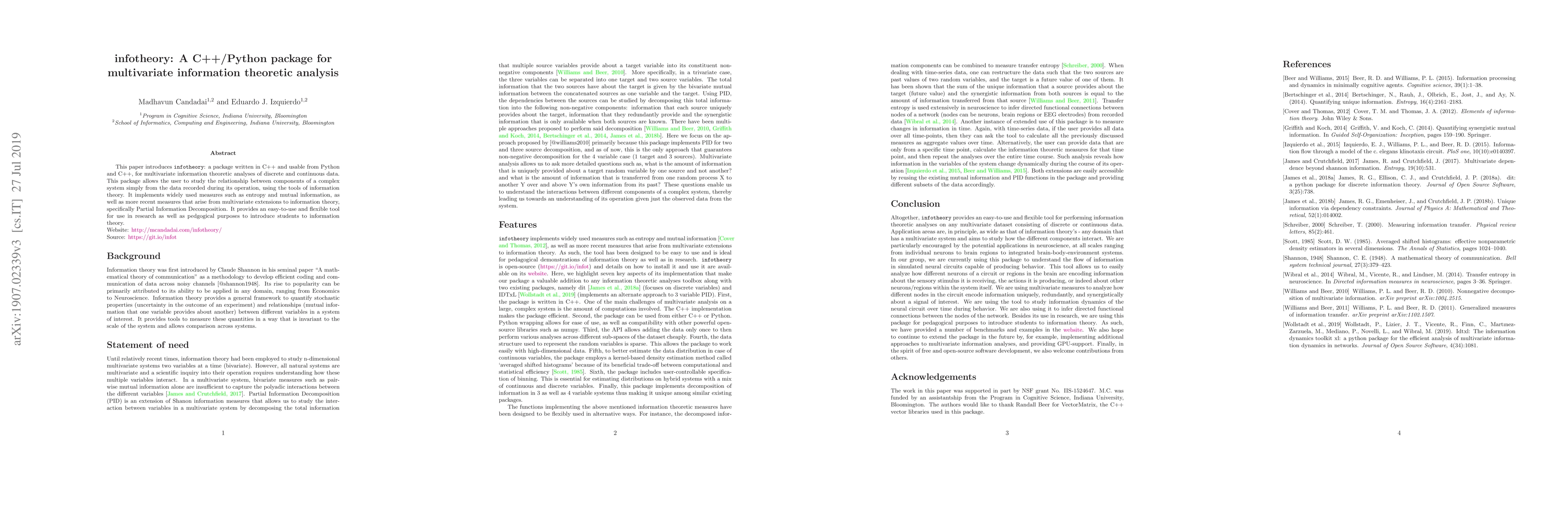 The paper introduces \texttt{infotheory}, a versatile C++/Python package for multivariate information theoretic analysis, implementing measures like entropy and mutual information, and facilitating research and educational applications in information theory. Available at http://mcandadai.com/infotheory/.