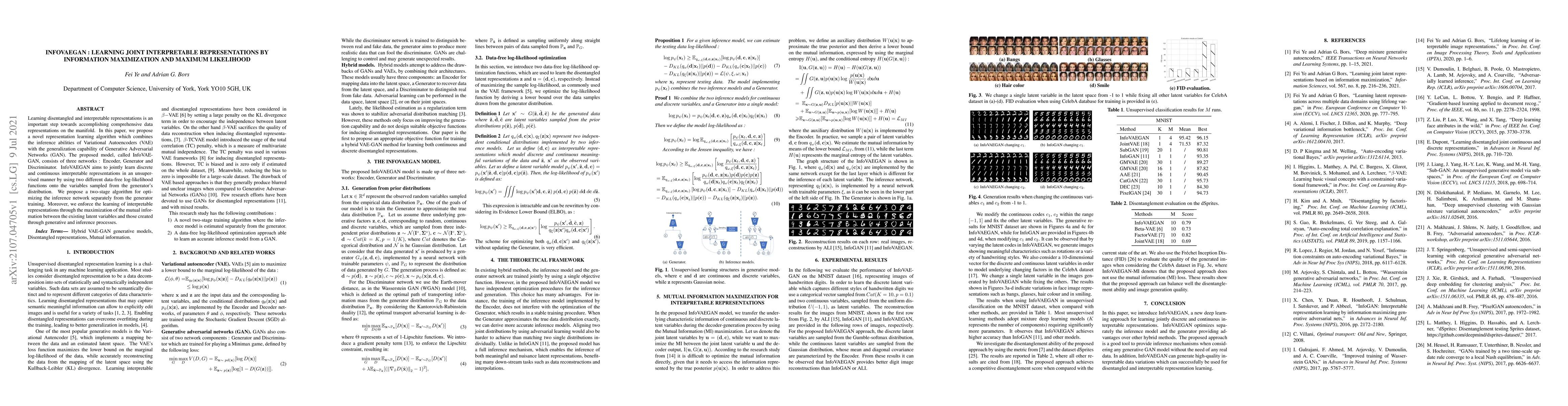 InfoVAEGAN combines Variational Autoencoders and Generative Adversarial Networks to learn disentangled and interpretable representations. It uses two data-free log-likelihood functions and maximizes mutual information to achieve interpretable representations in an unsupervised manner.