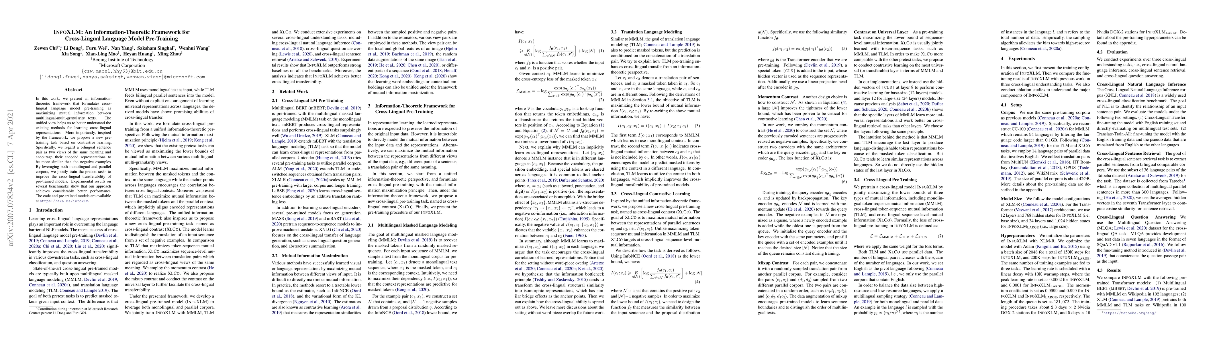 This paper introduces an information-theoretic framework for cross-lingual language model pre-training, aiming to maximize mutual information across multilingual texts. It proposes a new contrastive pre-training task that enhances cross-lingual representation learning, leading to improved performance on various benchmarks.