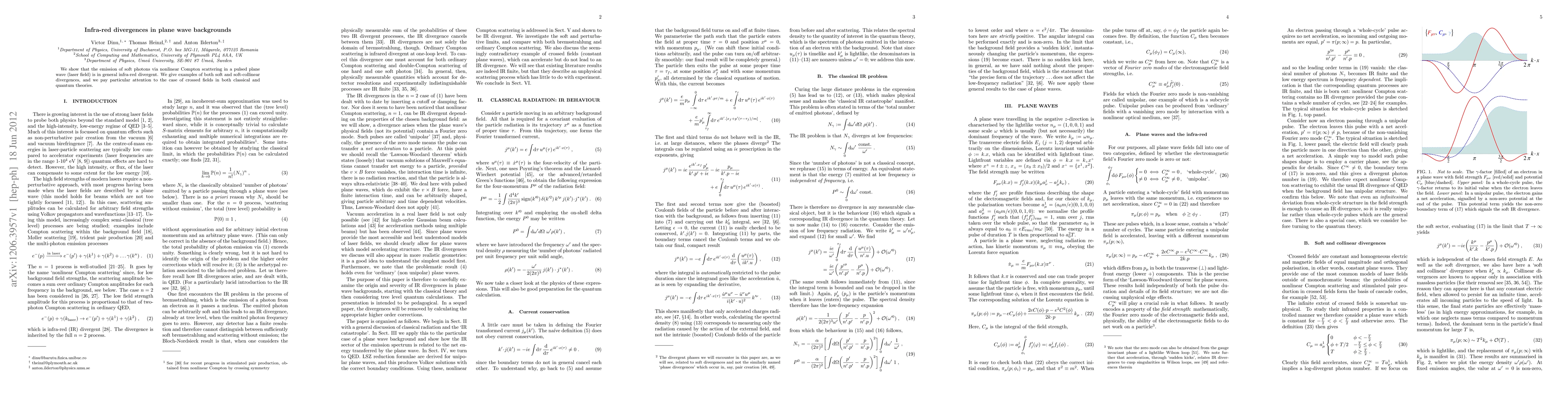 This paper demonstrates that soft photon emission through nonlinear Compton scattering in pulsed plane waves (laser fields) exhibits infra-red divergences, including both soft and soft-collinear types. It specifically examines these divergences in the context of crossed fields in both classical and quantum frameworks.