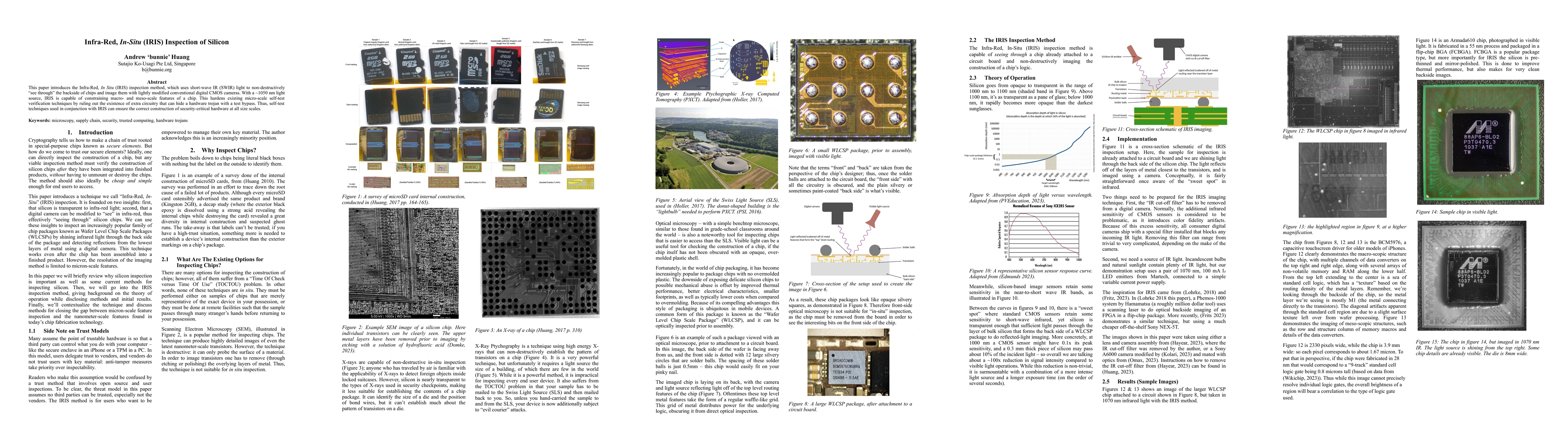 This paper presents the IRIS inspection method, which uses short-wave infrared light to non-destructively image the backside of silicon chips, enhancing micro-scale self-test verification and ensuring the absence of hidden hardware trojans. The method employs a ~1050 nm light source and conventional CMOS cameras for macro- and meso-scale feature detection.