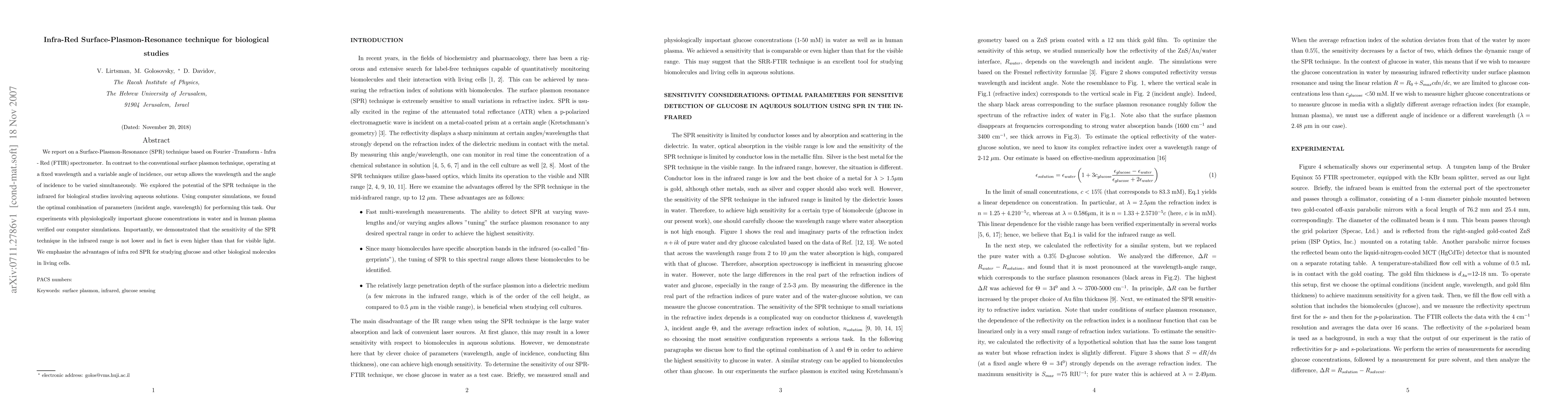 This paper introduces an advanced Fourier-Transform Infrared (FTIR) Surface-Plasmon-Resonance (SPR) technique that allows simultaneous variation of wavelength and angle of incidence, enhancing sensitivity for biological studies. Experiments confirm the technique's superior sensitivity in the infrared range for detecting glucose in aqueous solutions and human plasma.