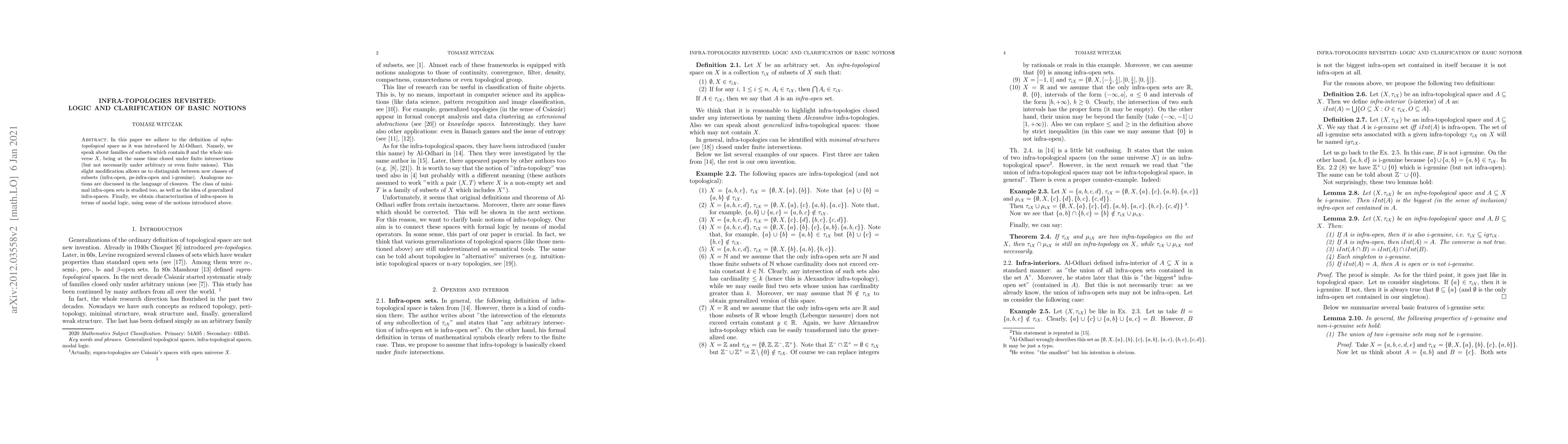 In this paper we adhere to the definition of infra-topological space as it was introduced by Al-Odhari. Namely, we speak about families of subsets which contain empty set and the whole universe X, being at the same time closed under finite intersections (but not necessarily under arbitrary or even finite unions). This slight modification allows us to distinguish between new classes of subsets (infra-open, ps-infra-open and i-genuine). Analogous notions are discussed in the language of closures. The class of minimal infra-open sets is studied too, as well as the idea of generalized infra-spaces. Finally, we obtain characterization of infra-spaces in terms of modal logic, using some of the notions introduced above.