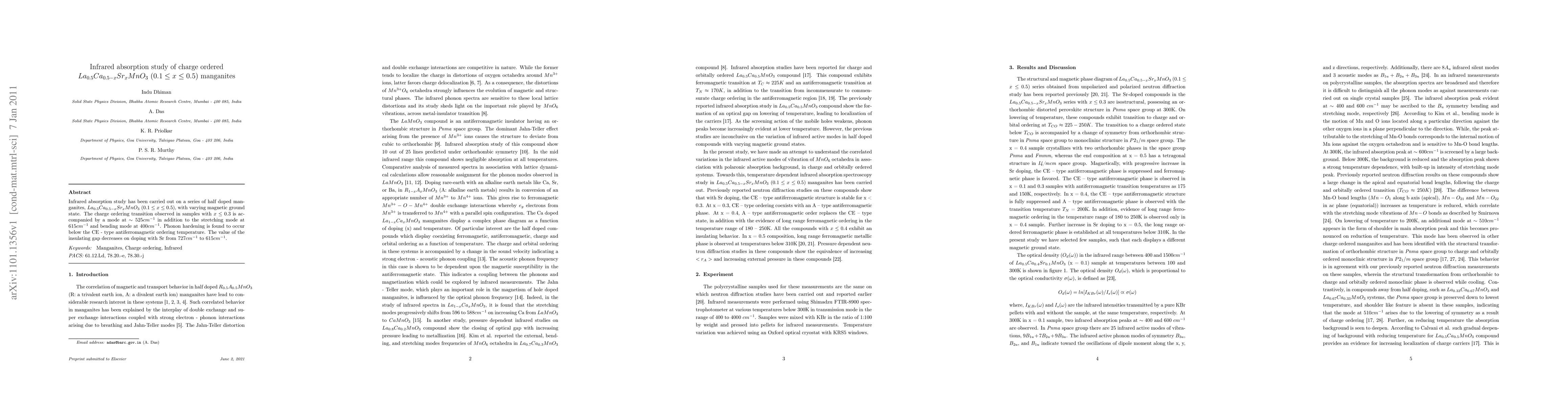 This study investigates the infrared absorption in $La_{0.5}Ca_{0.5-x}Sr_{x}MnO_{3}$ manganites, revealing a charge ordering transition with additional phonon modes at $\sim525cm^{-1}$ and $615cm^{-1}$, alongside phonon hardening below the antiferromagnetic ordering temperature. The insulating gap decreases from $727cm^{-1}$ to $615cm^{-1}$ with increasing Sr doping.