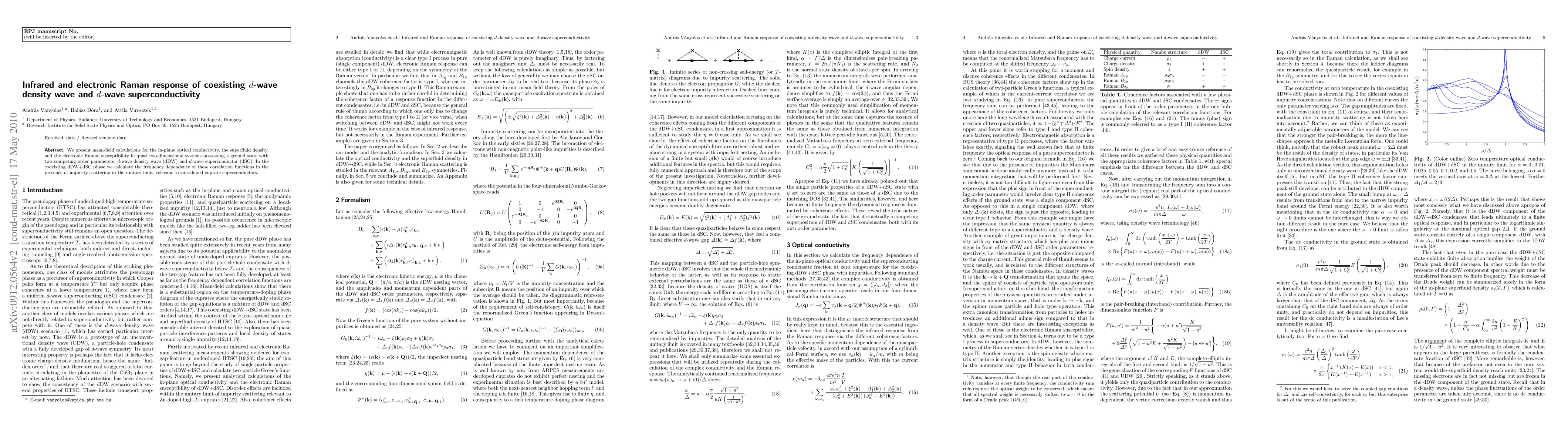 We present mean-field calculations for the in-plane optical conductivity, the superfluid density, and the electronic Raman susceptibility in quasi two-dimensional systems possessing a ground state with two competing order parameters: d-wave density wave (dDW) and d-wave superconductor (dSC). In the coexisting dDW+dSC phase we calculate the frequency dependence of these correlation functions in the presence of impurity scattering in the unitary limit, relevant to zinc-doped cuprate superconductors.