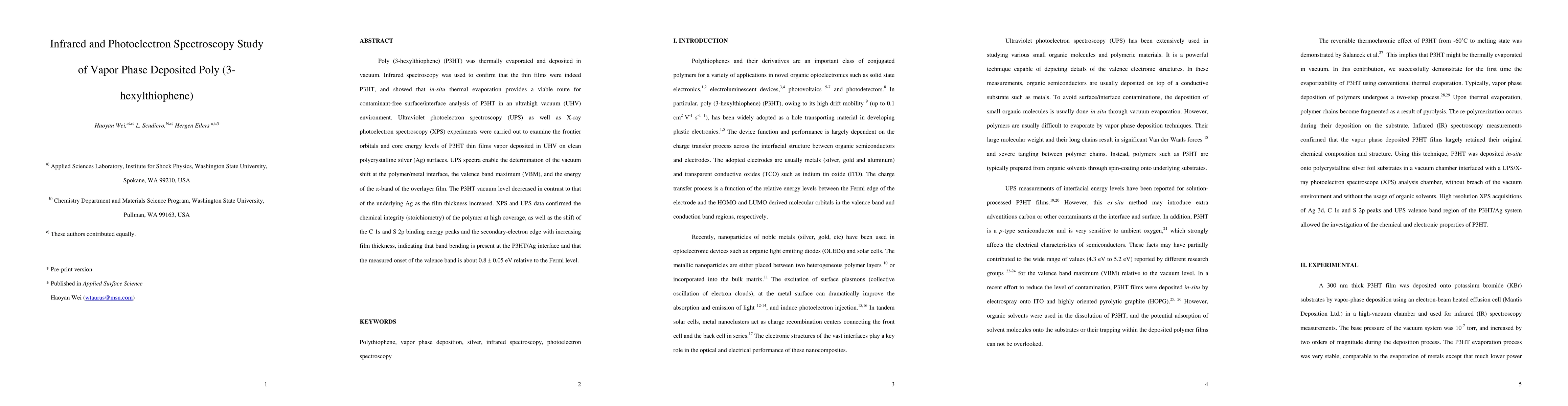 Poly (3-hexylthiophene) (P3HT) was thermally evaporated and deposited in vacuum. Infrared spectroscopy was used to confirm that the thin films were indeed P3HT, and showed that in-situ thermal evaporation provides a viable route for contaminant-free surface/interface analysis of P3HT in an ultrahigh vacuum (UHV) environment. Ultraviolet photoelectron spectroscopy (UPS) as well as X-ray photoelectron spectroscopy (XPS) experiments were carried out to examine the frontier orbitals and core energy levels of P3HT thin films vapor deposited in UHV on clean polycrystalline silver (Ag) surfaces. UPS spectra enable the determination of the vacuum shift at the polymer/metal interface, the valence band maximum (VBM), and the energy of the \Pi-band of the overlayer film. The P3HT vacuum level decreased in contrast to that of the underlying Ag as the film thickness increased. XPS and UPS data confirmed the chemical integrity (stoichiometry) of the polymer at high coverage, as well as the shift of the C 1s and S 2p binding energy peaks and the secondary-electron edge with increasing film thickness, indicating that band bending is present at the P3HT/Ag interface and that the measured onset of the valence band is about 0.8 +- 0.05 eV relative to the Fermi level.