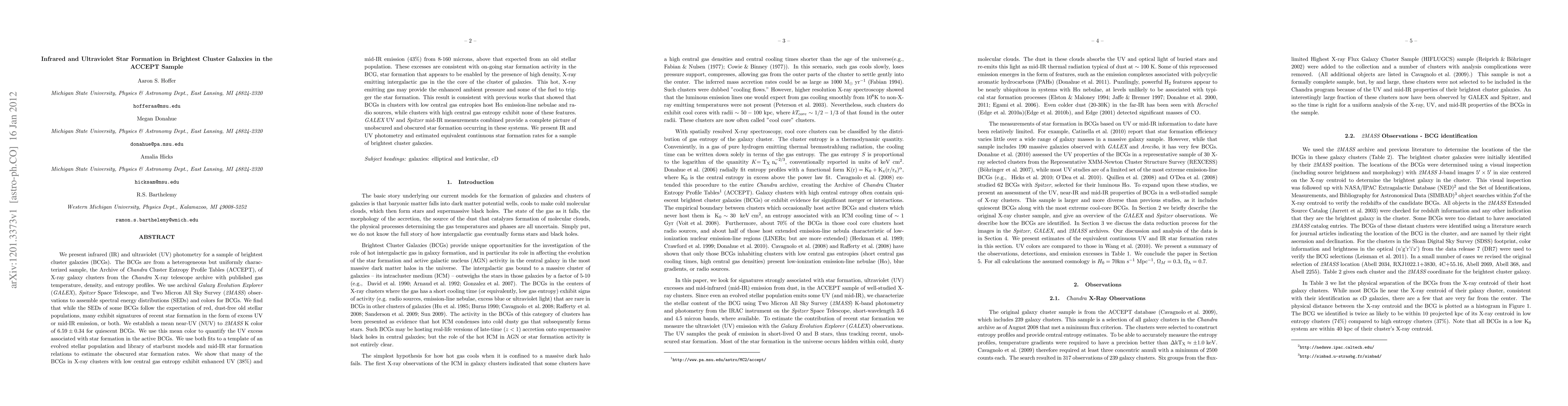 This study investigates infrared (IR) and ultraviolet (UV) star formation in brightest cluster galaxies (BCGs) from the ACCEPT sample, using archival data from GALEX, Spitzer, and 2MASS. It finds that while some BCGs exhibit old stellar populations, many show signs of recent star formation, with enhanced UV and mid-IR emissions indicating ongoing star formation likely triggered by high-density, X-ray emitting gas in the cluster core.