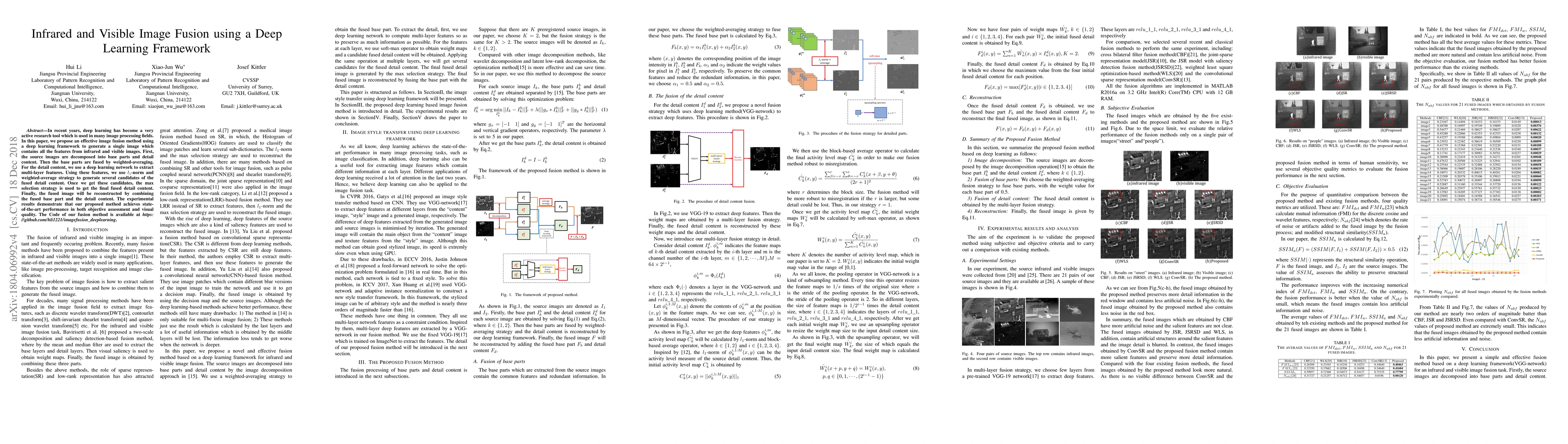 This paper proposes a deep learning framework for fusing infrared and visible images to generate a single image that retains features from both. The method decomposes the source images into base parts and detail content, fuses the base parts via weighted-averaging, and uses a deep learning network to extract and fuse the detail content, achieving state-of-the-art performance.