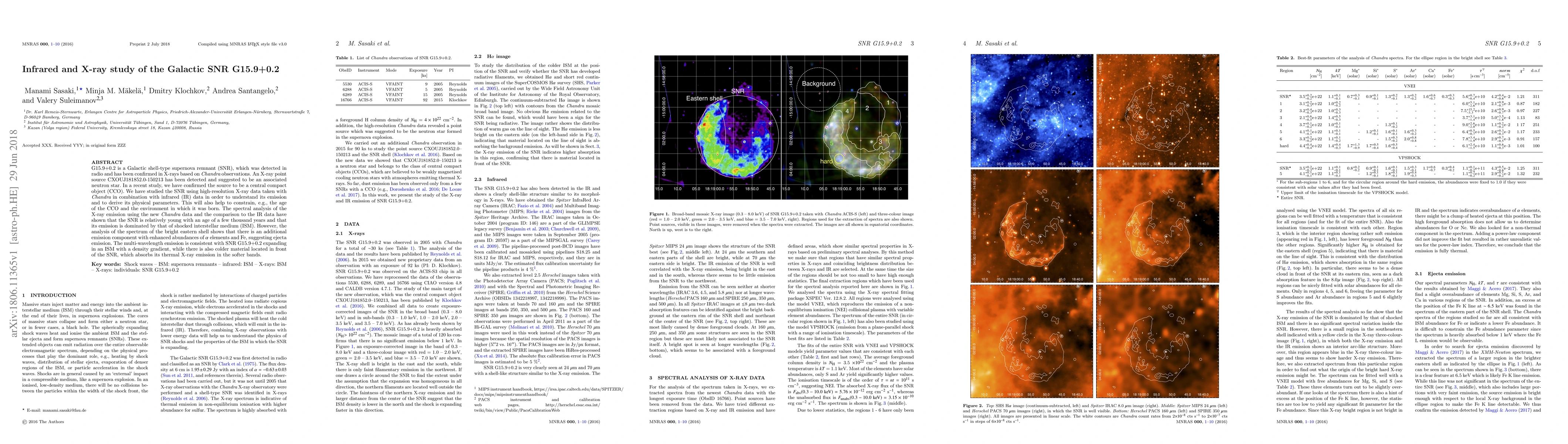 G15.9+0.2 is a Galactic shell-type supernova remnant (SNR), which was detected in radio and has been confirmed in X-rays based on Chandra observations. An X-ray point source CXOUJ181852.0-150213 has been detected and suggested to be an associated neutron star. In a recent study, we have confirmed the source to be a central compact object (CCO). We have studied the SNR using high-resolution X-ray data taken with Chandra in combination with infrared (IR) data in order to understand its emission and to derive its physical parameters. This will also help to constrain, e.g., the age of the CCO and the environment in which it was born. The spectral analysis of the X-ray emission using the new Chandra data and the comparison to the IR data have shown that the SNR is relatively young with an age of a few thousand years and that its emission is dominated by that of shocked interstellar medium (ISM). However, the analysis of the spectrum of the bright eastern shell shows that there is an additional emission component with enhanced abundances of {\alpha} elements and Fe, suggesting ejecta emission. The multi-wavelength emission is consistent with SNR G15.9+0.2 expanding in an ISM with a density gradient, while there is also colder material located in front of the SNR, which absorbs its thermal X-ray emission in the softer bands.