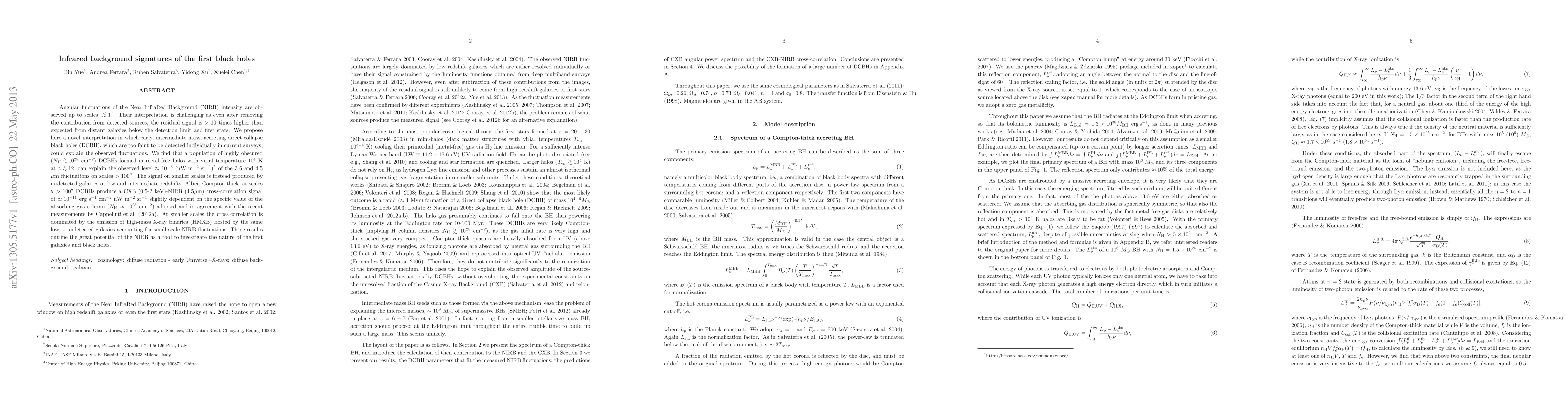 Angular fluctuations of the Near InfraRed Background (NIRB) intensity are observed up to scales $\simlt 1^{\ensuremath{^{\circ}}}$. Their interpretation is challenging as even after removing the contribution from detected sources, the residual signal is $>10$ times higher than expected from distant galaxies below the detection limit and first stars. We propose here a novel interpretation in which early, intermediate mass, accreting direct collapse black holes (DCBH), which are too faint to be detected individually in current surveys, could explain the observed fluctuations. We find that a population of highly obscured ($N_{\rm H}\simgt 10^{25} \rm cm^{-2}$) DCBHs formed in metal-free halos with virial temperature $10^4$ K at $z\simgt 12$, can explain the observed level $\approx 10^{-3}$ (nW m$^{-2}$ sr$^{-1})^2$ of the 3.6 and 4.5 $\mu$m fluctuations on scales $>100''$. The signal on smaller scales is instead produced by undetected galaxies at low and intermediate redshifts. Albeit Compton-thick, at scales $\theta> 100''$ DCBHs produce a CXB (0.5-2 keV)-NIRB ($4.5 \rm \mu m$) cross-correlation signal of $\simeq 10^{-11}$ erg s$^{-1}$ cm$^{-2}$ nW m$^{-2}$ sr$^{-1}$ slightly dependent on the specific value of the absorbing gas column ($N_{\rm H} \approx 10^{25} \rm cm^{-2}$) adopted and in agreement with the recent measurements by \cite{2012arXiv1210.5302C}. At smaller scales the cross-correlation is dominated by the emission of high-mass X-ray binaries (HMXB) hosted by the same low-$z$, undetected galaxies accounting for small scale NIRB fluctuations. These results outline the great potential of the NIRB as a tool to investigate the nature of the first galaxies and black holes.
