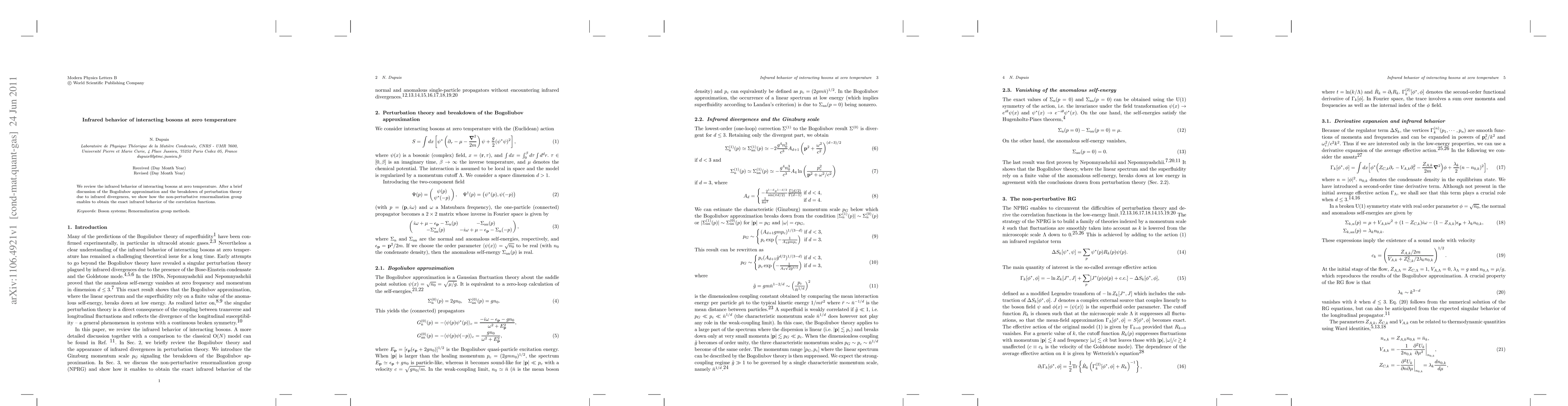 This paper reviews the infrared behavior of interacting bosons at zero temperature, highlighting the limitations of perturbation theory and the use of non-perturbative renormalization group methods to accurately determine the exact infrared behavior of correlation functions.