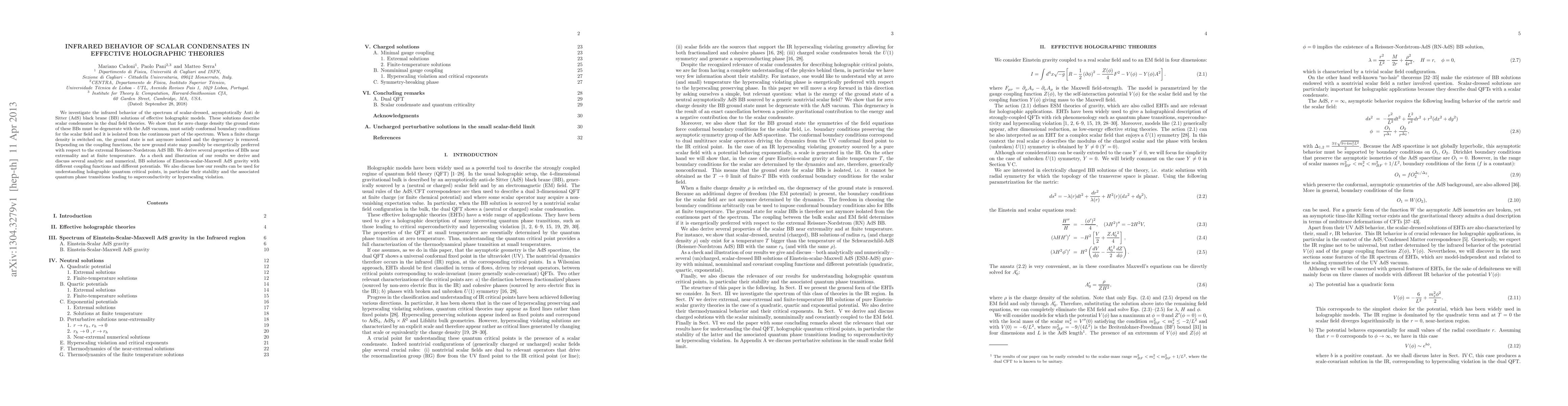 We investigate the infrared behavior of the spectrum of scalar-dressed, asymptotically Anti de Sitter (AdS) black brane (BB) solutions of effective holographic models. These solutions describe scalar condensates in the dual field theories. We show that for zero charge density the ground state of these BBs must be degenerate with the AdS vacuum, must satisfy conformal boundary conditions for the scalar field and it is isolated from the continuous part of the spectrum. When a finite charge density is switched on, the ground state is not anymore isolated and the degeneracy is removed. Depending on the coupling functions, the new ground state may possibly be energetically preferred with respect to the extremal Reissner-Nordstrom AdS BB. We derive several properties of BBs near extremality and at finite temperature. As a check and illustration of our results we derive and discuss several analytic and numerical, BB solutions of Einstein-scalar-Maxwell AdS gravity with different coupling functions and different potentials. We also discuss how our results can be used for understanding holographic quantum critical points, in particular their stability and the associated quantum phase transitions leading to superconductivity or hyperscaling violation.