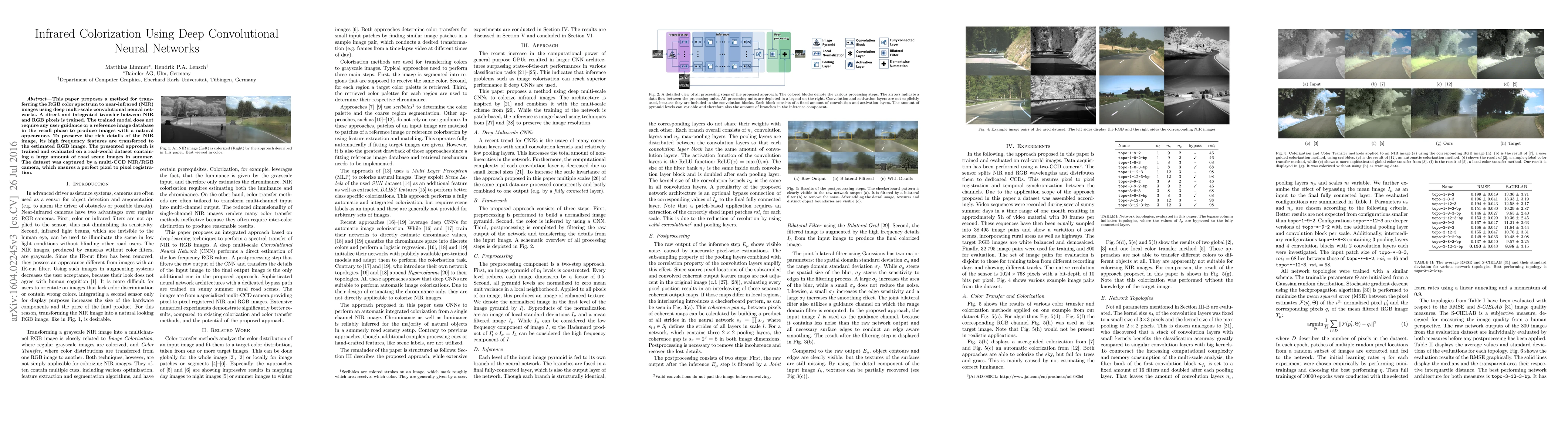 This paper introduces a deep convolutional neural network for transferring RGB color to NIR images, trained without user guidance or reference databases. The model preserves NIR image details by transferring high-frequency features, evaluated on a real-world dataset of road scenes captured by a multi-CCD NIR/RGB camera.