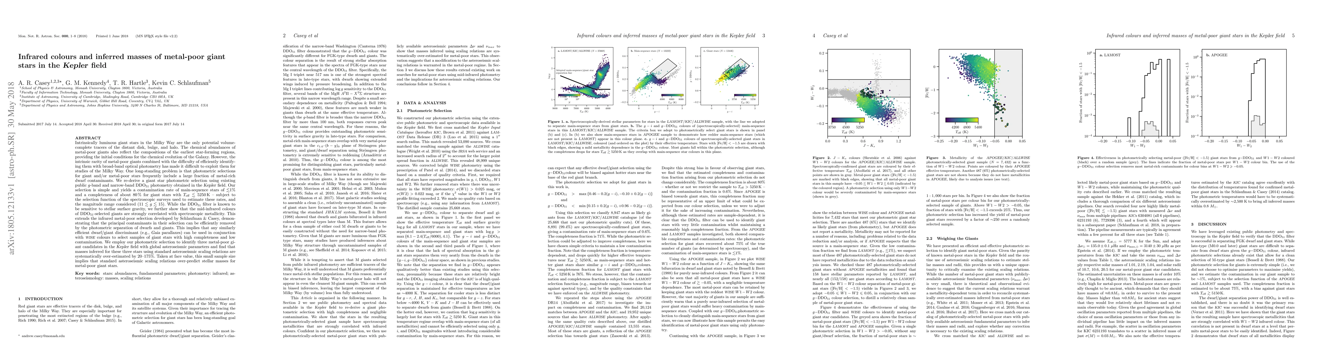 Intrinsically luminous giant stars in the Milky Way are the only potential volume-complete tracers of the distant disk, bulge, and halo. The chemical abundances of metal-poor giants also reflect the compositions of the earliest star-forming regions, providing the initial conditions for the chemical evolution of the Galaxy. However, the intrinsic rarity of metal-poor giants combined with the difficulty of efficiently identifying them with broad-band optical photometry has made it difficult to exploit them for studies of the Milky Way. We re-derive a giant star photometric selection using existing public g-band and narrow-band DDO51 photometry obtained in the Kepler field. Our selection is simple and yields a contamination rate of main-sequence stars of $\lesssim$1% and a completeness of about 80% for giant stars with $T_{\rm eff} \lesssim 5250$ K - subject to the selection function of the spectroscopic surveys used to estimate these rates, and the magnitude range considered ($11\lesssim g\lesssim 15$). While the DDO51 filter is known to be sensitive to stellar surface gravity, we further show that the mid-infrared colours of DDO51-selected giants are strongly correlated with spectroscopic metallicity. This extends the infrared selection developed by Schlaufman & Casey, demonstrating that the principal contaminants in their selection can be efficiently removed by the photometric separation of dwarfs and giants. This implies that any similarly efficient dwarf/giant discriminant (e.g., Gaia) can be used with WISE colours to select samples of giant stars with high completeness and low contamination. We employ our photometric selection to identify three metal-poor giant candidates in the Kepler field with global asteroseismic parameters and find that masses inferred for these three stars using standard asteroseismic scaling relations are systematically over-estimated by 20-175%. [abridged]