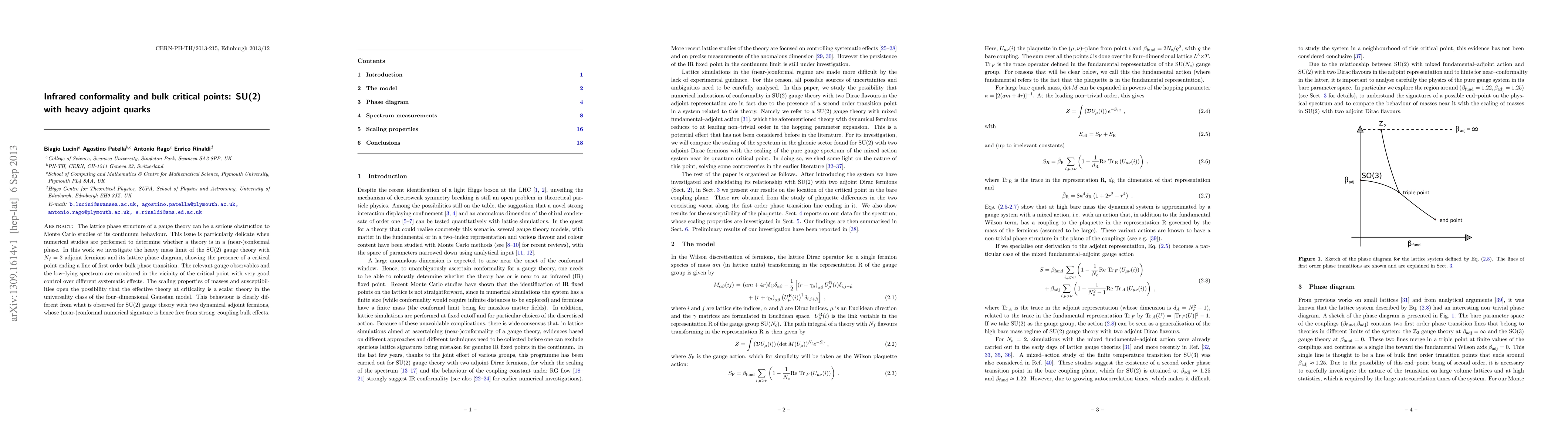 The lattice phase structure of a gauge theory can be a serious obstruction to Monte Carlo studies of its continuum behaviour. This issue is particularly delicate when numerical studies are performed to determine whether a theory is in a (near-)conformal phase. In this work we investigate the heavy mass limit of the SU(2) gauge theory with Nf=2 adjoint fermions and its lattice phase diagram, showing the presence of a critical point ending a line of first order bulk phase transition. The relevant gauge observables and the low-lying spectrum are monitored in the vicinity of the critical point with very good control over different systematic effects. The scaling properties of masses and susceptibilities open the possibility that the effective theory at criticality is a scalar theory in the universality class of the four-dimensional Gaussian model. This behaviour is clearly different from what is observed for SU(2) gauge theory with two dynamical adjoint fermions, whose (near-)conformal numerical signature is hence free from strong-coupling bulk effects.