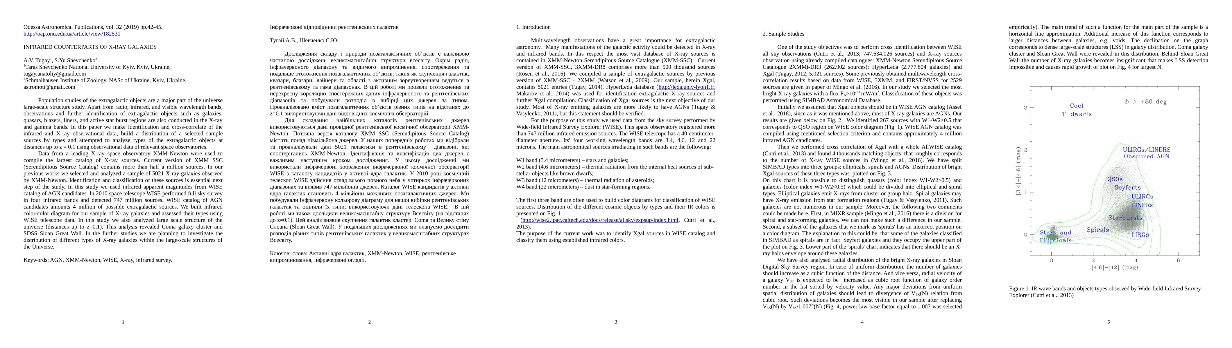 Population studies of the extragalactic objects are a major part of the universe large-scale structure study. Apart from radio, infrared, and visible wavelength bands, observations and further identification of extragalactic objects such as galaxies, quasars, blazers, liners, and active star burst regions are also conducted in the X-ray and gamma bands. In this paper we make identification and cross-correlate of the infrared and X-ray observational data, build a distribution of a selected sample sources by types and attempted to analyze types of the extragalactic objects at distances up to z = 0.1 using observational data of relevant space observatories. Data from a leading X-ray space observatory XMM-Newton were used to compile the largest catalog of X-ray sources. Current version of XMM SSC (Serendipitous Source Catalog) contains more than half a million sources. In our previous works we selected and analyzed a sample of 5021 X-ray galaxies observed by XMM-Newton. Identification and classification of these sources is essential next step of the study. In this study we used infrared apparent magnitudes from WISE catalog of AGN candidates. In 2010 space telescope WISE performed full sky survey in four infrared bands and detected 747 million sources. WISE catalog of AGN candidates amounts 4 million of possible extragalactic sources. We built infrared color-color diagram for our sample of X-ray galaxies and assessed their types using WISE telescope data. In this study we also analyzed large scale structure of the universe (distances up to z=0.1). This analysis revealed Coma galaxy cluster and SDSS Sloan Great Wall. In the further studies we are planning to investigate the distribution of different types of X-ray galaxies within the large-scale structures of the Universe.