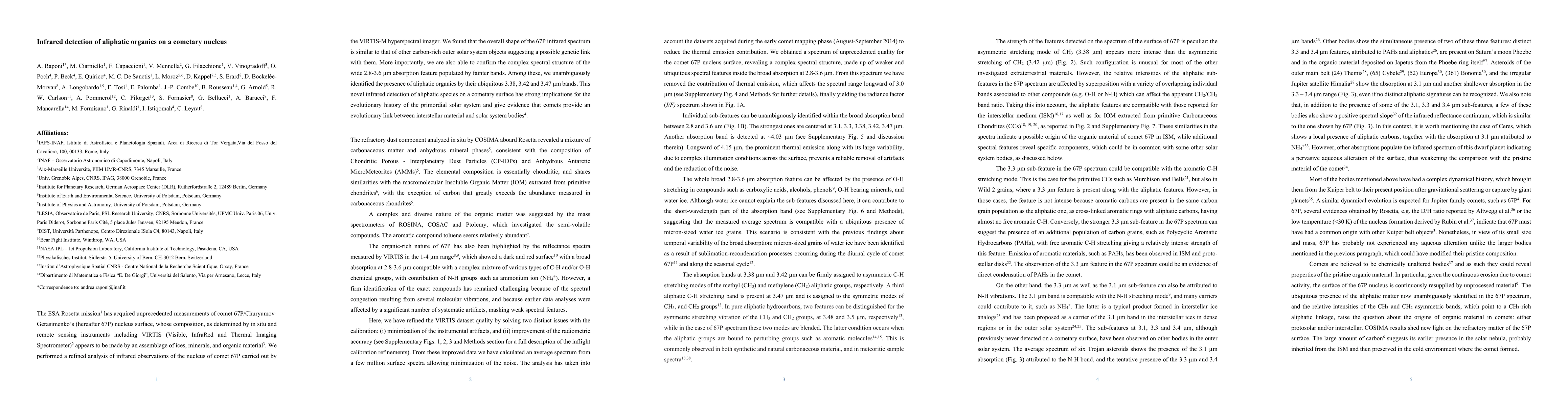 The ESA Rosetta mission has acquired unprecedented measurements of comet 67/P-Churyumov-Gerasimenko (hereafter 67P) nucleus surface, whose composition, as determined by in situ and remote sensing instruments including VIRTIS (Visible, InfraRed and Thermal Imaging Spectrometer) appears to be made by an assemblage of ices, minerals, and organic material. We performed a refined analysis of infrared observations of the nucleus of comet 67P carried out by the VIRTIS-M hyperspectral imager. We found that the overall shape of the 67P infrared spectrum is similar to that of other carbon-rich outer solar system objects suggesting a possible genetic link with them. More importantly, we are also able to confirm the complex spectral structure of the wide 2.8-3.6 micron absorption feature populated by fainter bands. Among these, we unambiguously identified the presence of aliphatic organics by their ubiquitous 3.38, 3.42 and 3.47 micron bands. This novel infrared detection of aliphatic species on a cometary surface has strong implications for the evolutionary history of the primordial solar system and give evidence that comets provide an evolutionary link between interstellar material and solar system bodies.