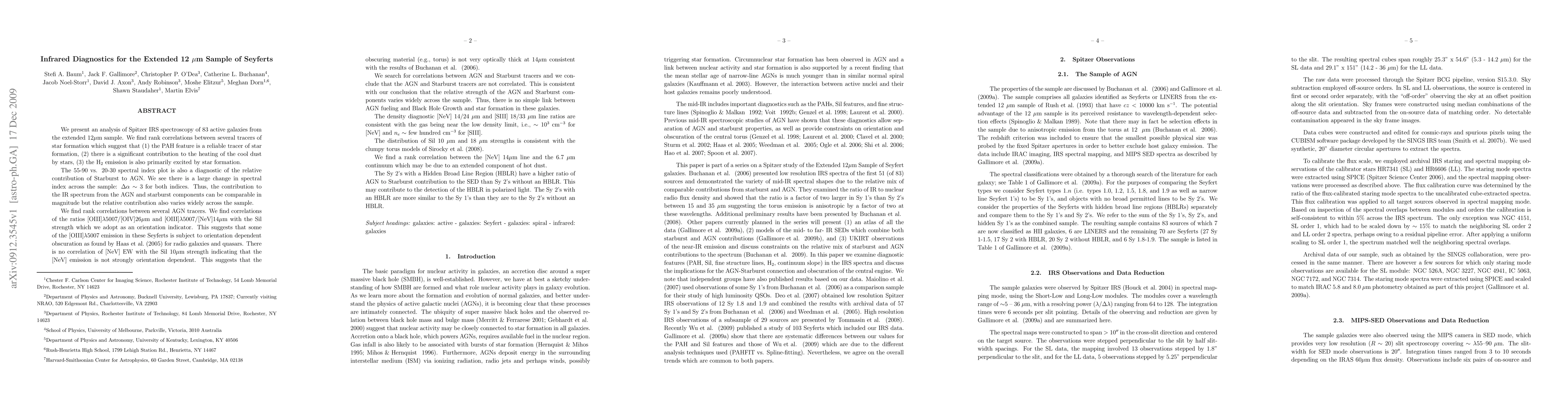We present an analysis of Spitzer IRS spectroscopy of 83 active galaxies from the extended 12 micron sample. We find rank correlations between several tracers of star formation which suggest that (1) the PAH feature is a reliable tracer of star formation, (2) there is a significant contribution to the heating of the cool dust by stars, (3) the H$_2$ emission is also primarily excited by star formation. The 55-90 vs. 20-30 spectral index plot is also a diagnostic of the relative contribution of Starburst to AGN. We see there is a large change in spectral index across the sample. Thus, the contribution to the IR spectrum from the AGN and starburst components can be comparable in magnitude but the relative contribution also varies widely across the sample. We find rank correlations between several AGN tracers. We search for correlations between AGN and Starburst tracers and we conclude that the AGN and Starburst tracers are not correlated. This is consistent with our conclusion that the relative strength of the AGN and Starburst components varies widely across the sample. Thus, there is no simple link between AGN fueling and Black Hole Growth and star formation in these galaxies. The distribution of Sil 10 micron and 18 micron strengths is consistent with the clumpy torus models of Sirocky et al. We find a rank correlation between the [NeV] 14 micron line and the 6.7 micron continuum which may be due to an extended component of hot dust. The Sy 2s with a Hidden Broad Line Region (HBLR) have a higher ratio of AGN to Starburst contribution to the SED than Sy 2s without an HBLR. This may contribute to the detection of the HBLR in polarized light. The Sy 2s with an HBLR are more similar to the Sy 1s than they are to the Sy 2s without an HBLR.