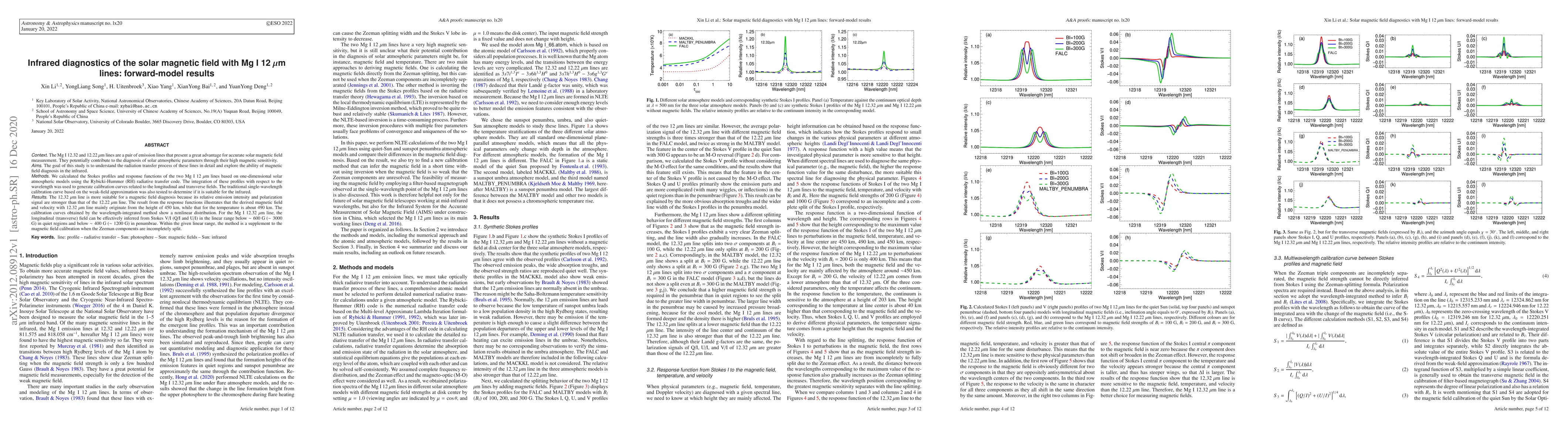 The Mg I 12.32 and 12.22 $\mu$m lines are a pair of emission lines that present a great advantage for accurate solar magnetic field measurement. They potentially contribute to the diagnosis of solar atmospheric parameters through their high magnetic sensitivity. The goal of this study is to understand the radiation transfer process of these lines in detail and explore the ability of magnetic field diagnosis in the infrared. We calculated the Stokes profiles and response functions of the two Mg I 12 $\mu$m lines based on one-dimensional solar atmospheric models using the Rybicki-Hummer (RH) radiative transfer code. The integration of these profiles with respect to the wavelength was used to generate calibration curves related to the longitudinal and transverse fields. The traditional single-wavelength calibration curve based on the weak-field approximation was also tested to determine if it is suitable for the infrared. The 12.32 $\mu$m line is more suitable for a magnetic field diagnosis because its relative emission intensity and polarization signal are stronger than that of the 12.22 $\mu$m line. The result from the response functions illustrates that the derived magnetic field and velocity with 12.32 $\mu$m line mainly originate from the height of 450 km, while that for the temperature is about 490 km. The calibration curves obtained by the wavelength-integrated method show a nonlinear distribution. For the Mg I 12.32 $\mu$m line, the longitudinal (transverse) field can be effectively inferred from Stokes V/I (Q/I and U/I) in the linear range below $\sim 600$ G ($\sim 3000$ G) in quiet regions and below $\sim 400$ G ($\sim 1200$ G) in penumbrae. Within the given linear range, the method is a supplement to the magnetic field calibration when the Zeeman components are incompletely split.