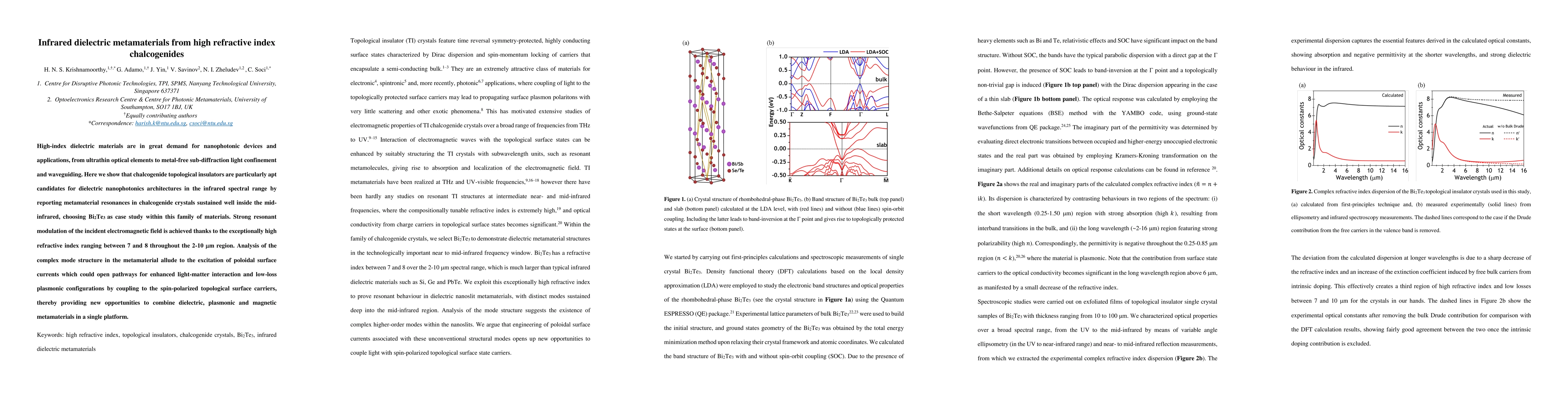This paper demonstrates that chalcogenide topological insulators, specifically Bi$_2$Te$_3$, can serve as effective dielectric metamaterials for infrared applications due to their high refractive index (7-8) in the mid-infrared range. These materials show strong electromagnetic field modulation and potential for enhanced light-matter interaction via topological surface carriers.