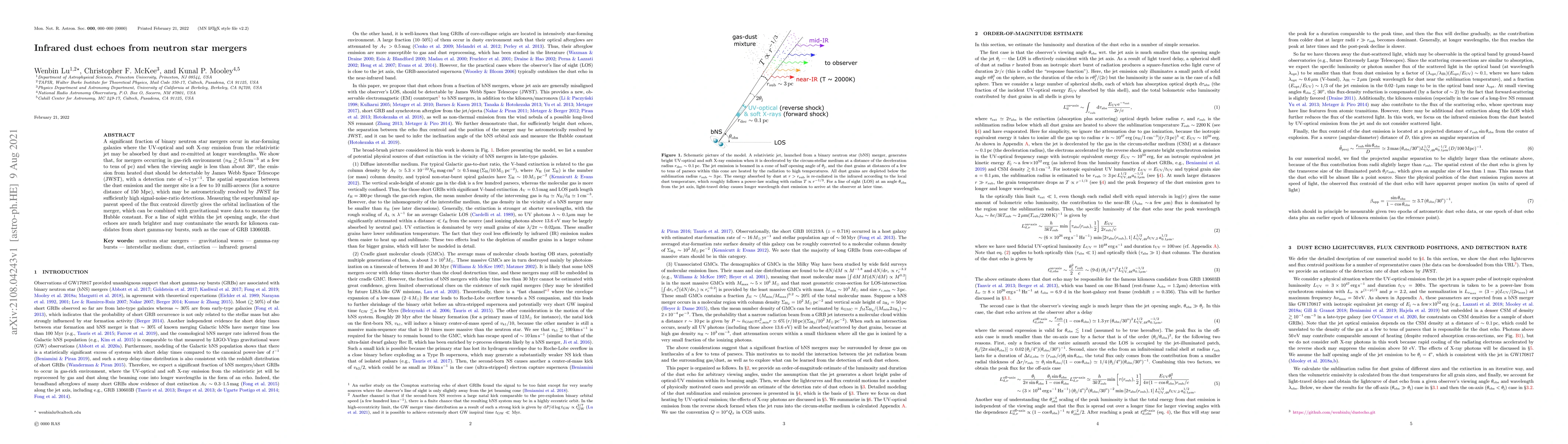 A significant fraction of binary neutron star mergers occur in star-forming galaxies where the UV-optical and soft X-ray afterglow emission from the relativistic jet may be absorbed by dust and re-emitted at longer wavelengths. We show that, for mergers occurring in gas-rich environment (n_H > 0.5 cm^{-3} at a few to tens of pc) and when the viewing angle is less than about 30 degrees, the emission from heated dust should be detectable by James Webb Space Telescope (JWST), with a detection rate of the order once per year. The spatial separation between the dust emission and the merger site is a few to 10 milli-arcsecs (for a source distance of 150 Mpc), which may be astrometrically resolved by JWST for sufficiently high signal-noise-ratio detections. Measuring the superluminal apparent speed of the flux centroid directly gives the orbital inclination of the merger, which can be combined with gravitational wave data to measure the Hubble constant. For a line of sight within the jet opening angle, the dust echoes are much brighter and may contaminate the search for kilonova candidates from short gamma-ray bursts, such as the case of GRB 130603B.