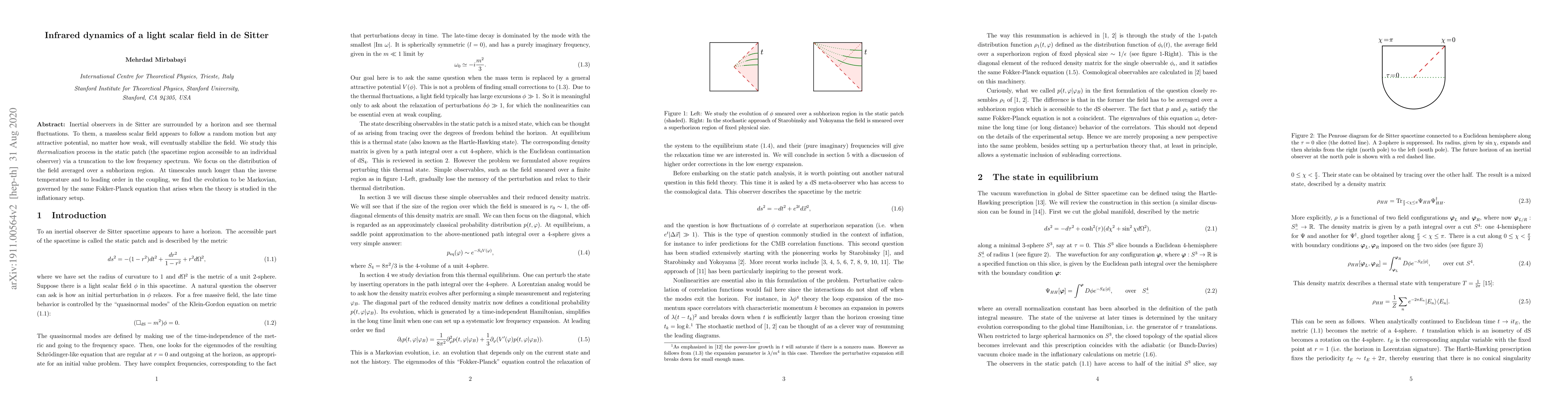 Inertial observers in de Sitter are surrounded by a horizon and see thermal fluctuations. To them, a massless scalar field appears to follow a random motion but any attractive potential, no matter how weak, will eventually stabilize the field. We study this thermalization process in the static patch (the spacetime region accessible to an individual observer) via a truncation to the low frequency spectrum. We focus on the distribution of the field averaged over a subhorizon region. At timescales much longer than the inverse temperature and to leading order in the coupling, we find the evolution to be Markovian, governed by the same Fokker-Planck equation that arises when the theory is studied in the inflationary setup.