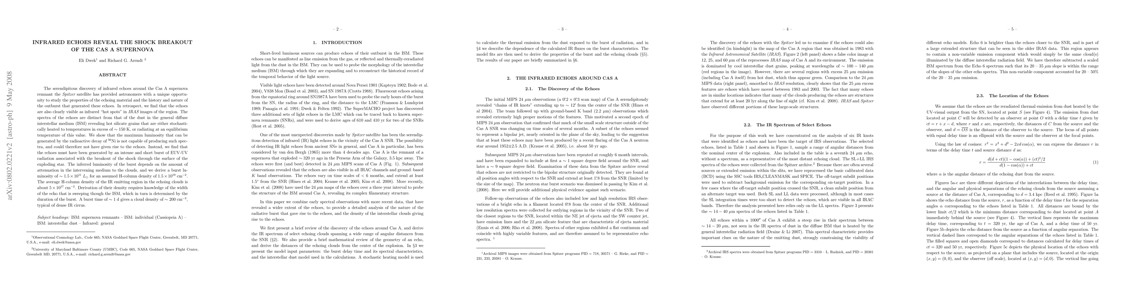 The Spitzer satellite discovered infrared echoes around the Cas A supernova remnant, revealing shock breakout caused by a short, intense burst of EUV-UV radiation, rather than the optical light from the supernova itself. These echoes indicate dense interstellar dust clouds heated to high temperatures.